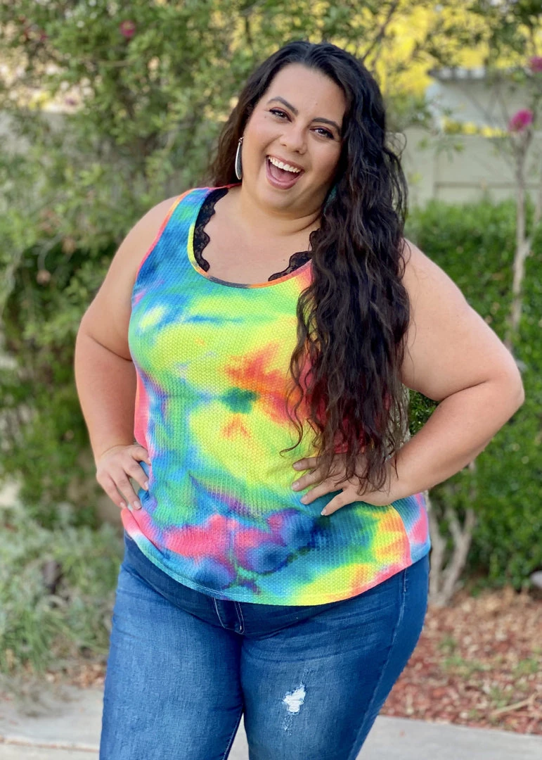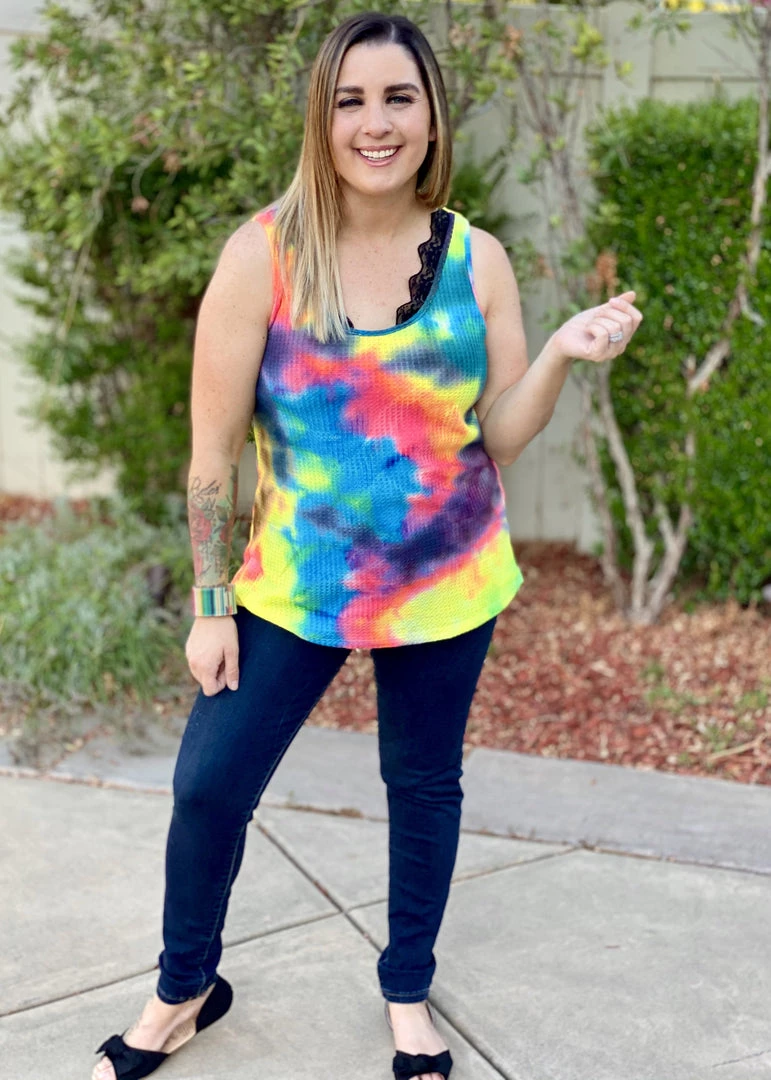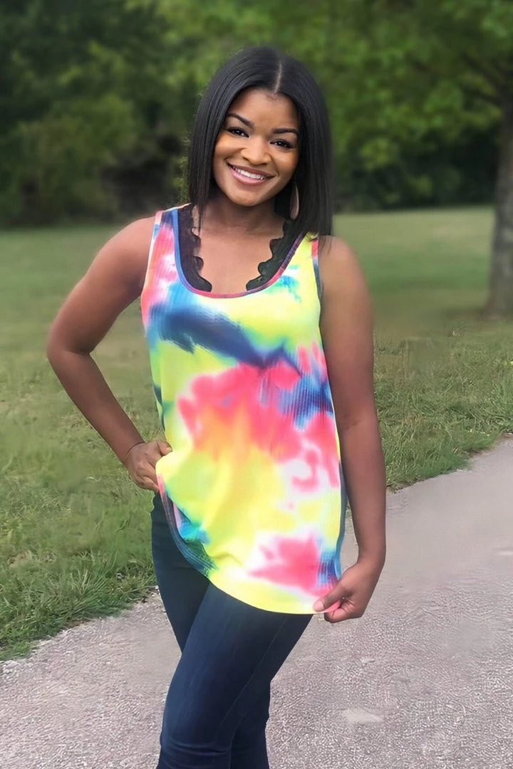 The neon colors in this amazing tie dye tank gives us a nostalgic feel from the 80’s. With a relaxed fit, this tank features no fuss straps and lace detailing around the scoop neck.Β