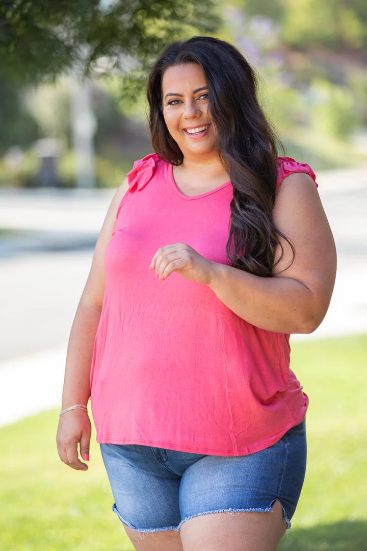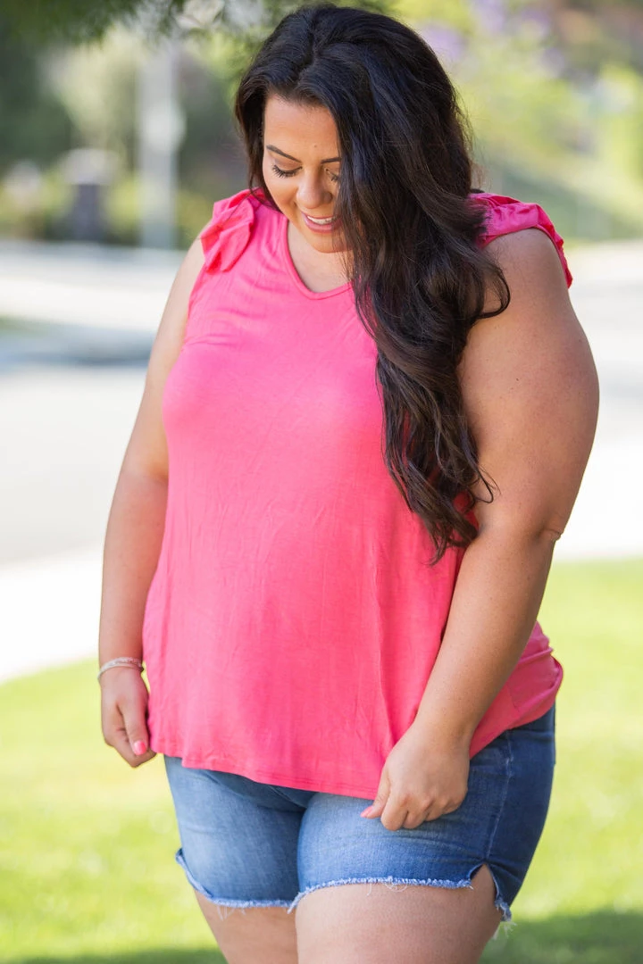 This sleeveless top has the most darling added touch of a ruffle detail on the shoulders. With a relaxed fit, this top features a v neck and rounded hem.Β
