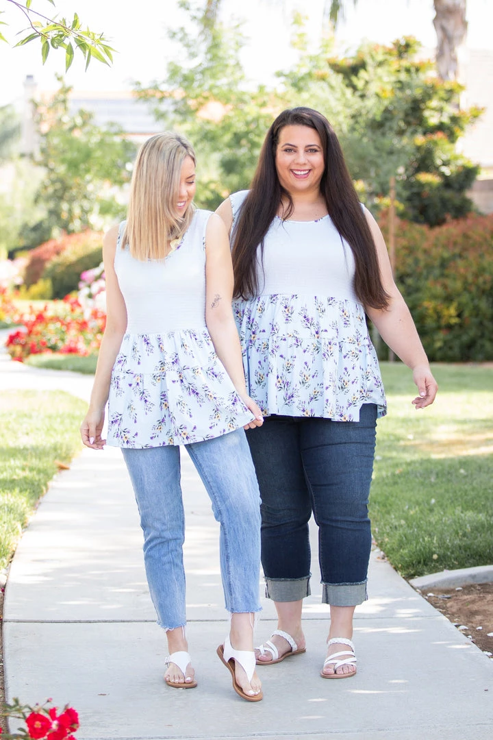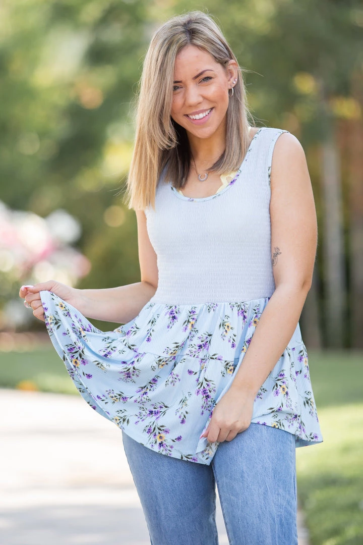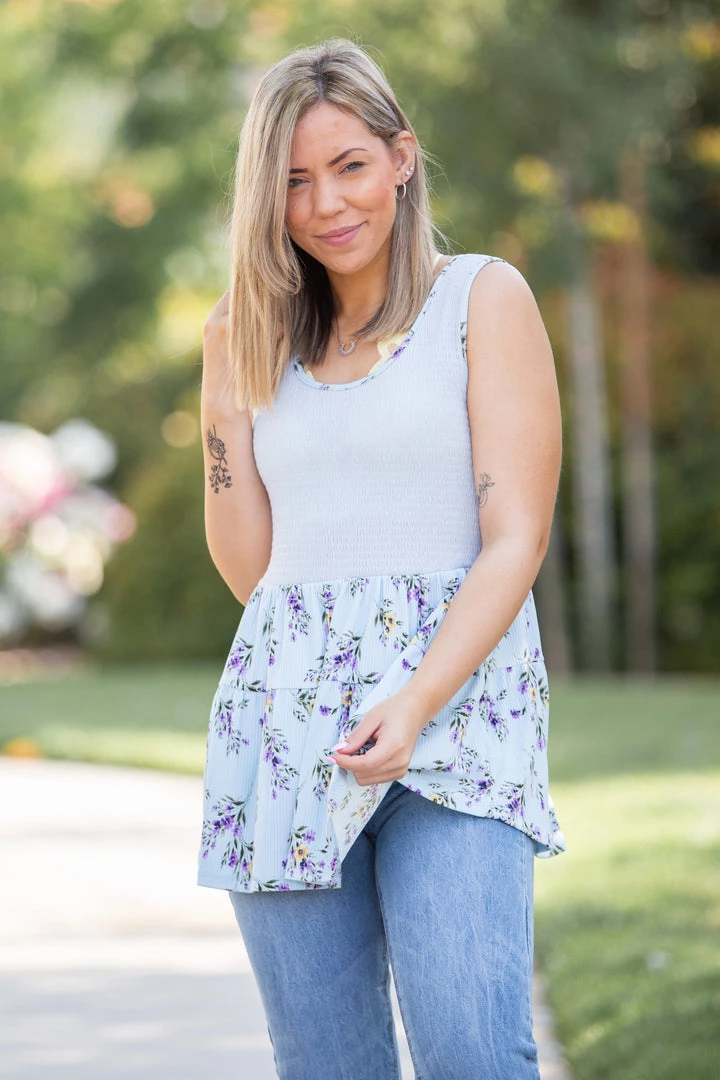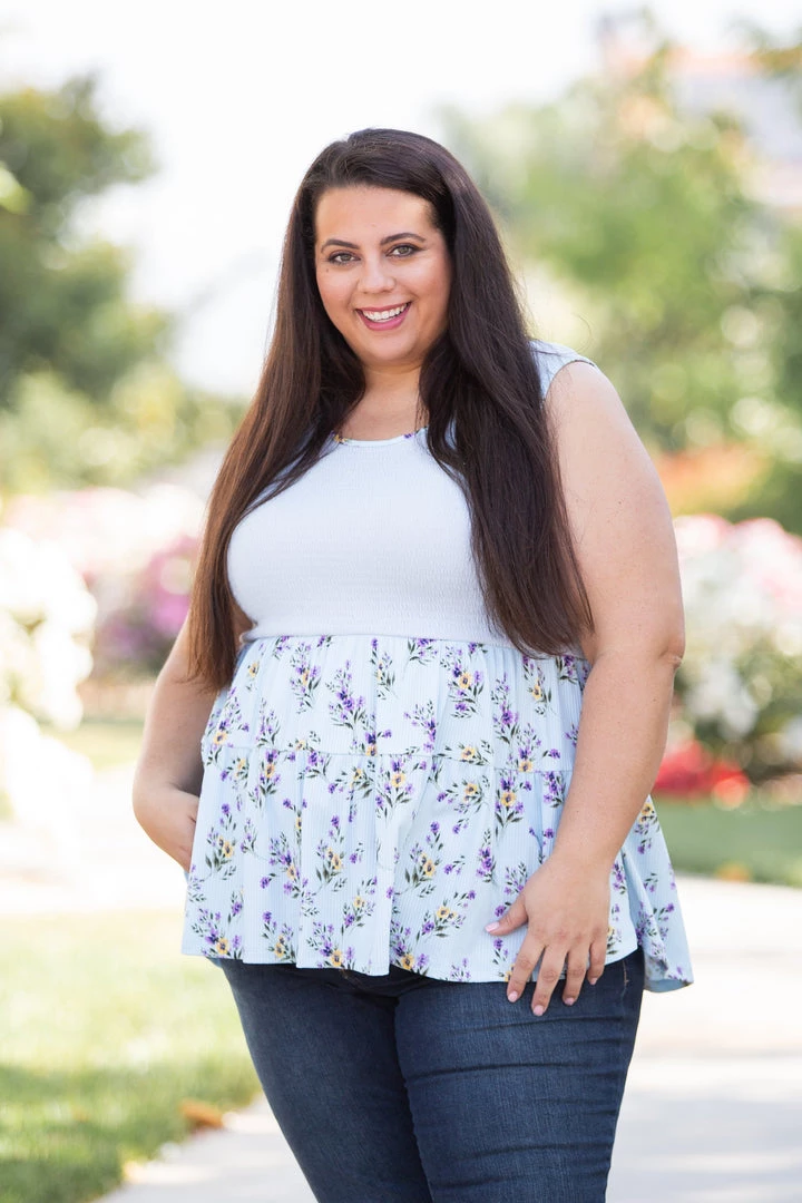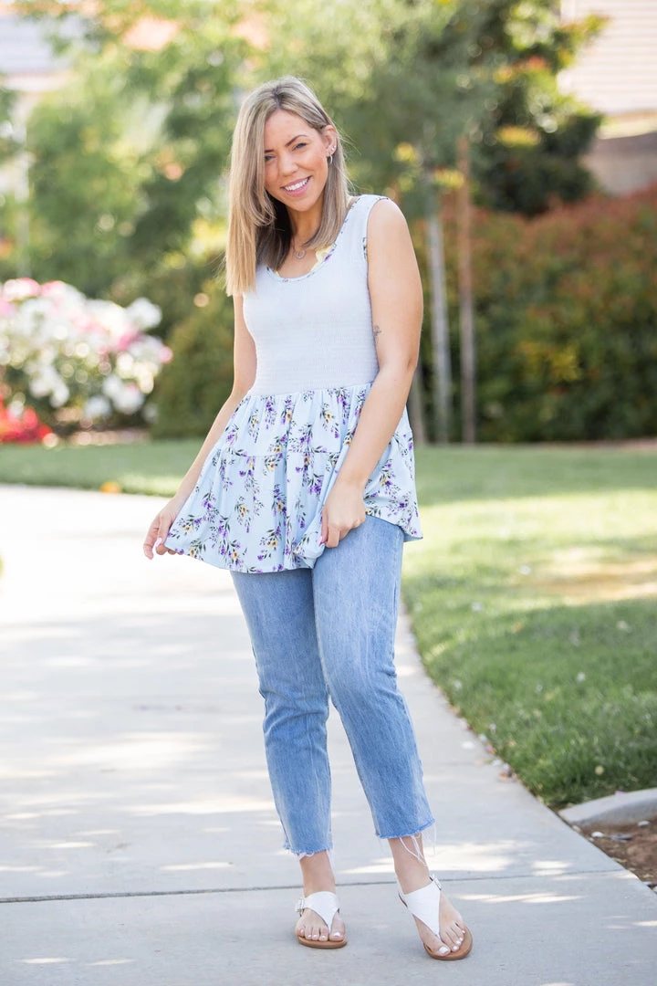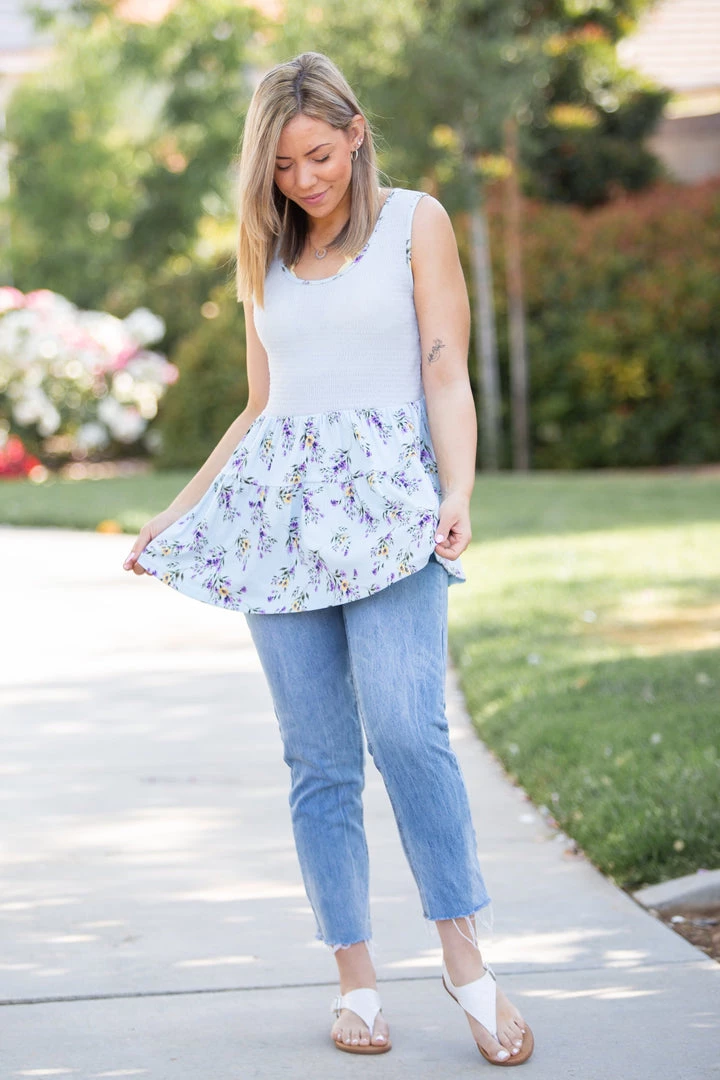 This sleeveless babydoll is the most perfect shade of baby blue. The mutli fabric gives this top such amazing texture and wow, is it stretchy! Featuring a round neckline , empire waist and square back, this top will pair well with just about anything!Β Β