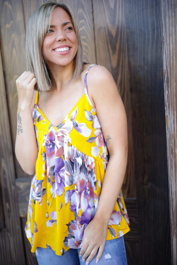 This super cute sleevless babydoll is perfect for to layer with or wear on it’s own. Made from bulgari fabric, this cami features a v-neck and spaghetti straps.