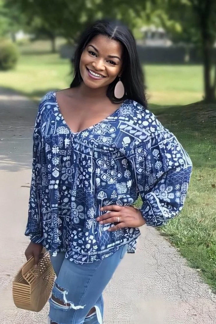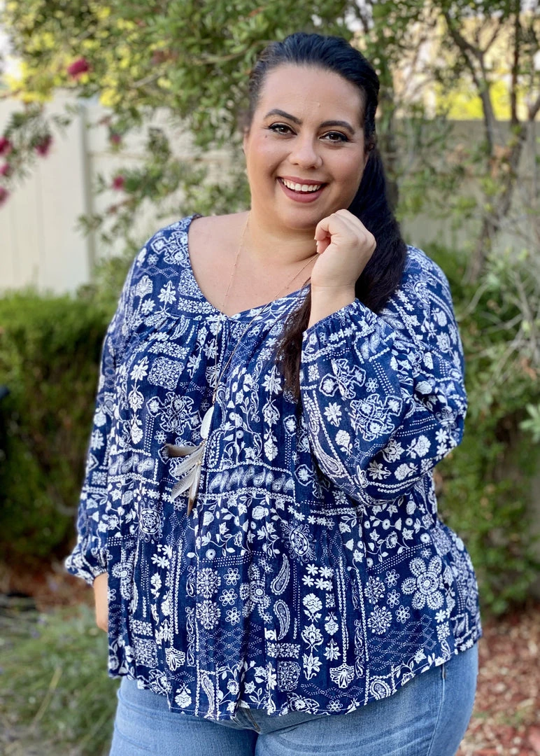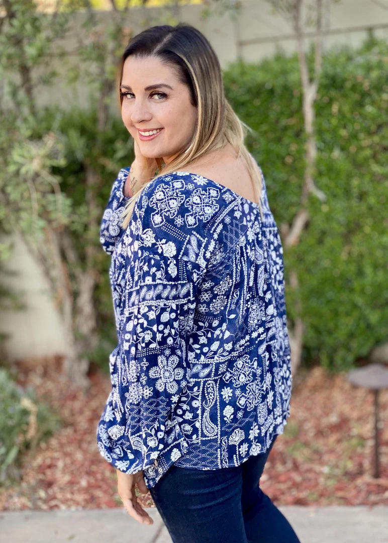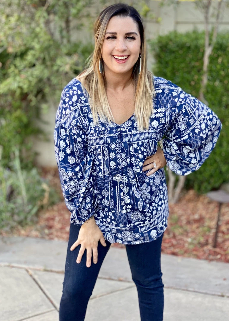 There’s no denying that a bandana print is one of the most beautiful around. This woven boxy blouse top is no exception! Featuring long bishop sleeves, a v-neck front AND back, flattering pleats that run all the way around, this shirt seriously has the most comfortable and flattering fit.Β Β