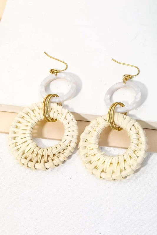 This gorgeous and absolute must have pair of drop earrings that is created with a straw circle weave disc drop earrings design. An absolute must have.
