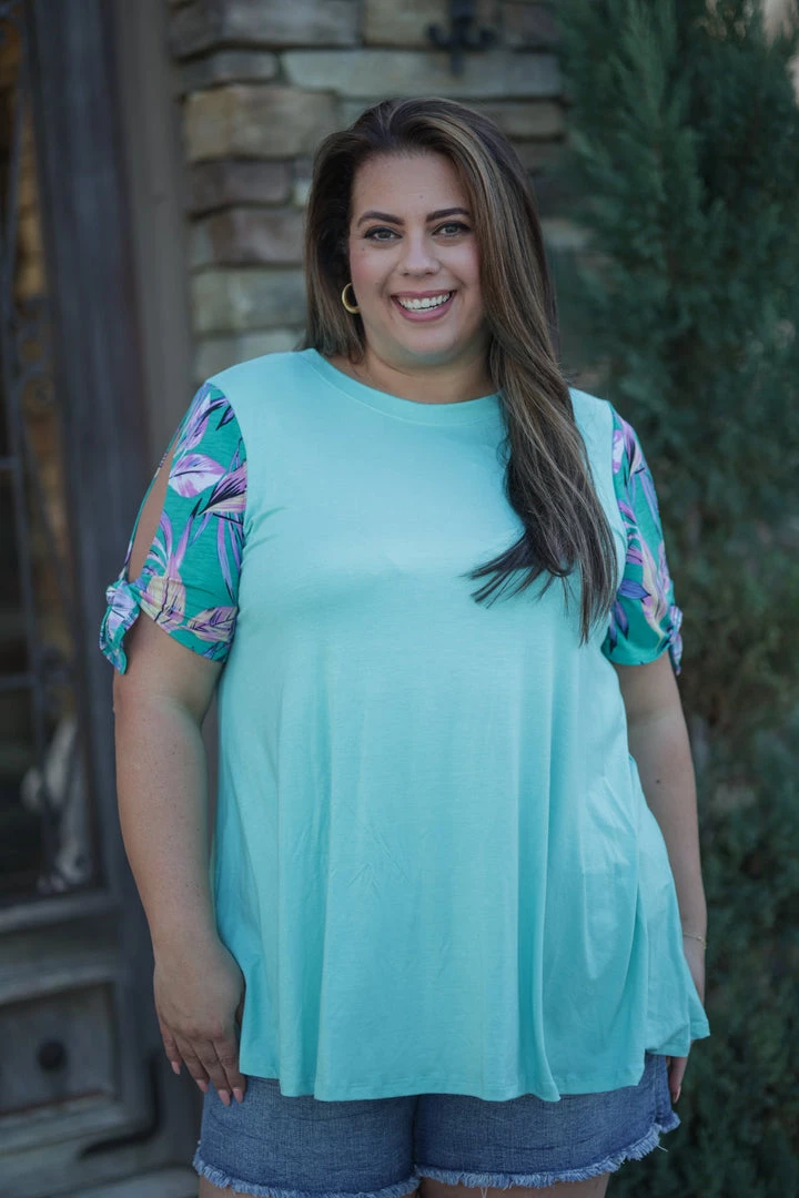 Bring on the joys of summer with this vibrant teal short sleeve top! With a relaxed fit, this top features open tie short sleeves, a round neckline and rounded hem..