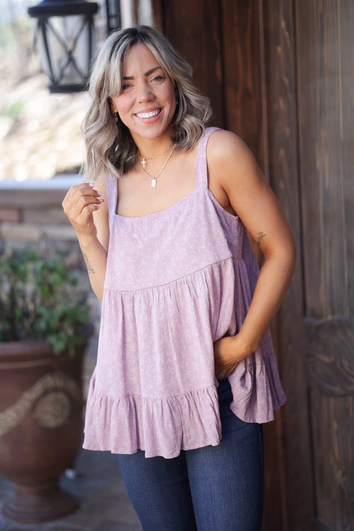 We are swooning over this mauve tiered ruffled tank. Made from a lightweight woven crinkle fabric, this top features a relaxed fit, square neckline, no fuss adjustable shoulder straps and tiered ruffled hem.