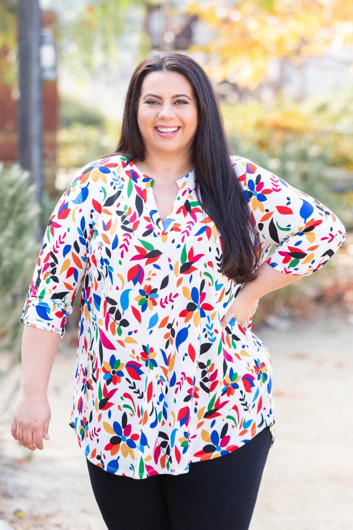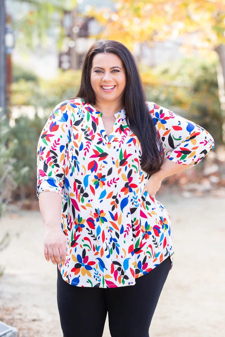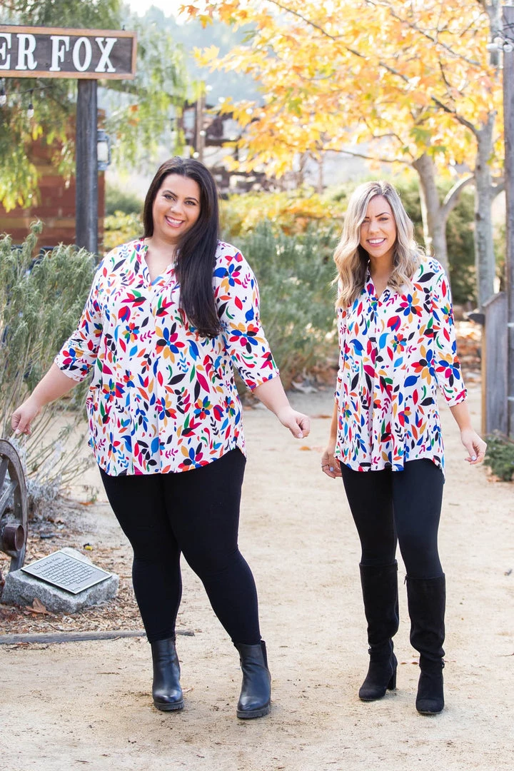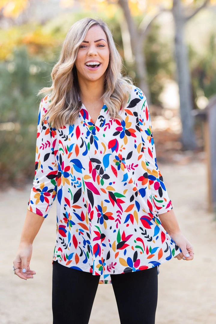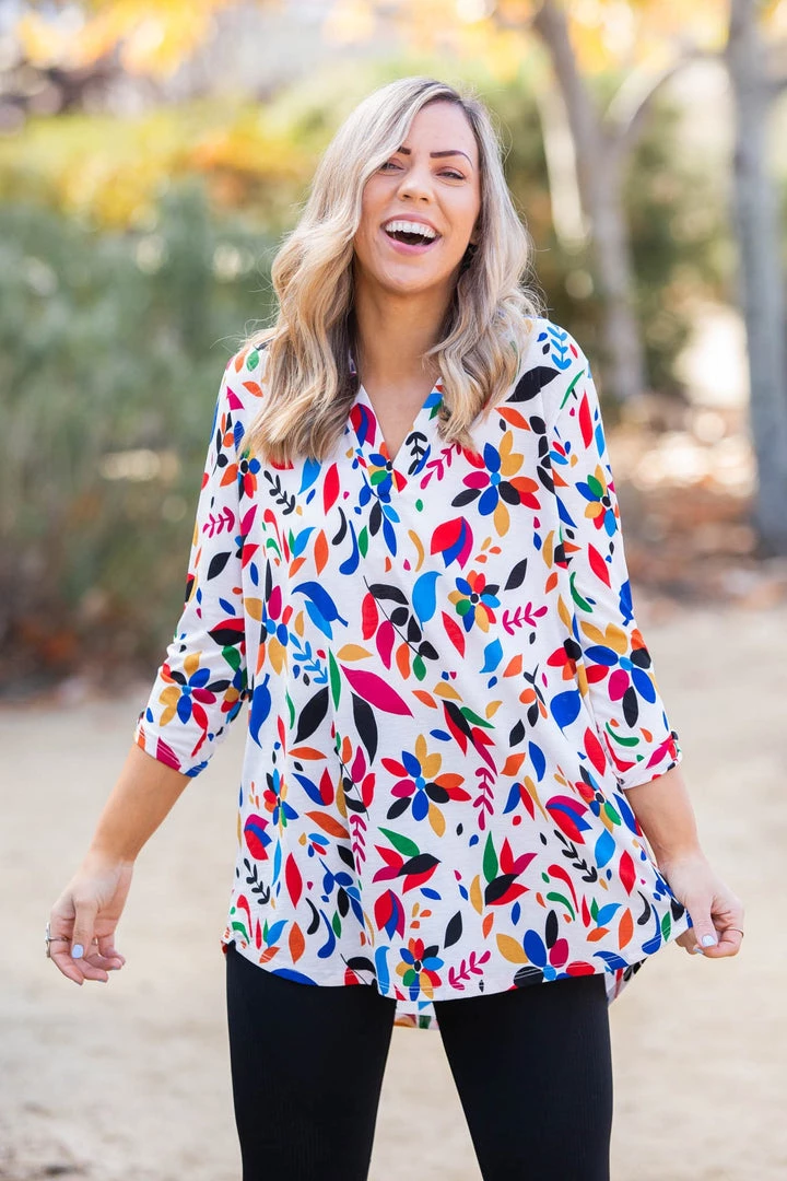 SearchingΒ for the perfect lightweight tunic? Look no further. The print on this Gabby has us feeling like we are vacationing in Boca Raton! Featuring a banded collar, v-neck and buttoned 3/4 sleeves, this top will make gettingΒ dressed seem effortless.Β Β