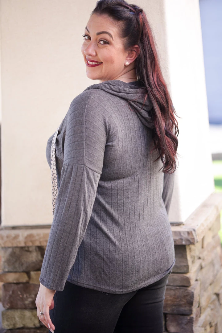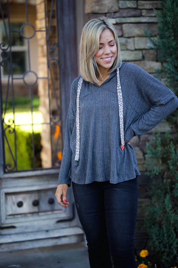 You won’t be able to live without this amazing hoodie. Not only is it incredibly soft, but it also has the most amazing fit. The open v-neck really lets the hood drape perfectly in the back, and those animal printed drawstrings add just the right amount of pop to this gorgeous charcoal hoodie.