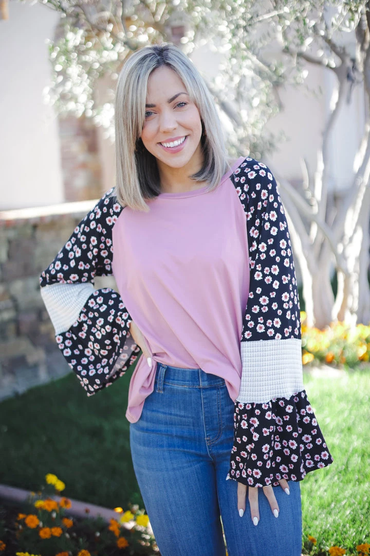 You will cherish this buttery soft bell sleeve with all you have. We are especially in love with those jacquard color block sleeves! With a relaxed fit, this top features a round neckline, long bell sleeves and rounded hem.