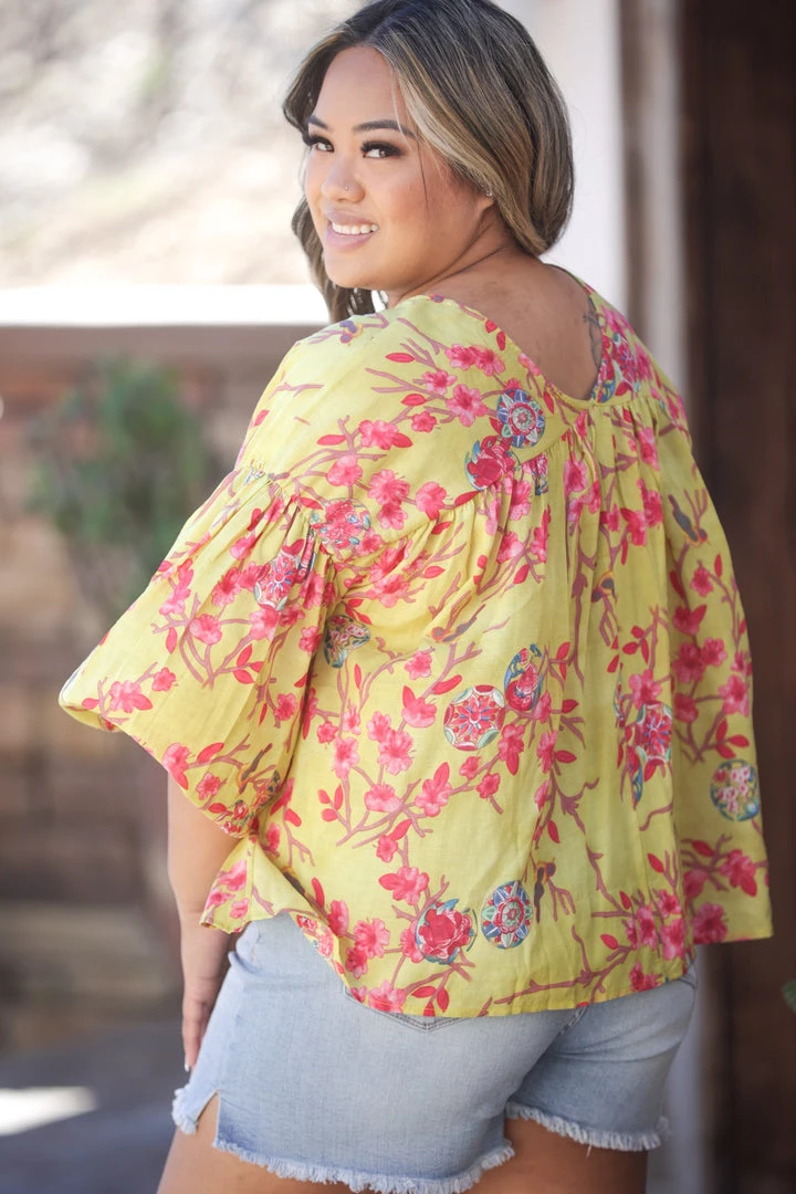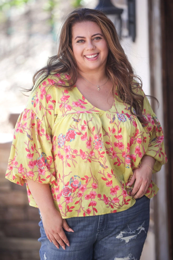 This floral printed woven babydoll is perfect for a day at the office or an evening out. With a relaxed fit, this top gestures a v-neck, long ballon sleeves with elastic cuffs and hi low hem.Β Β
