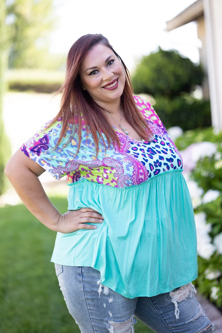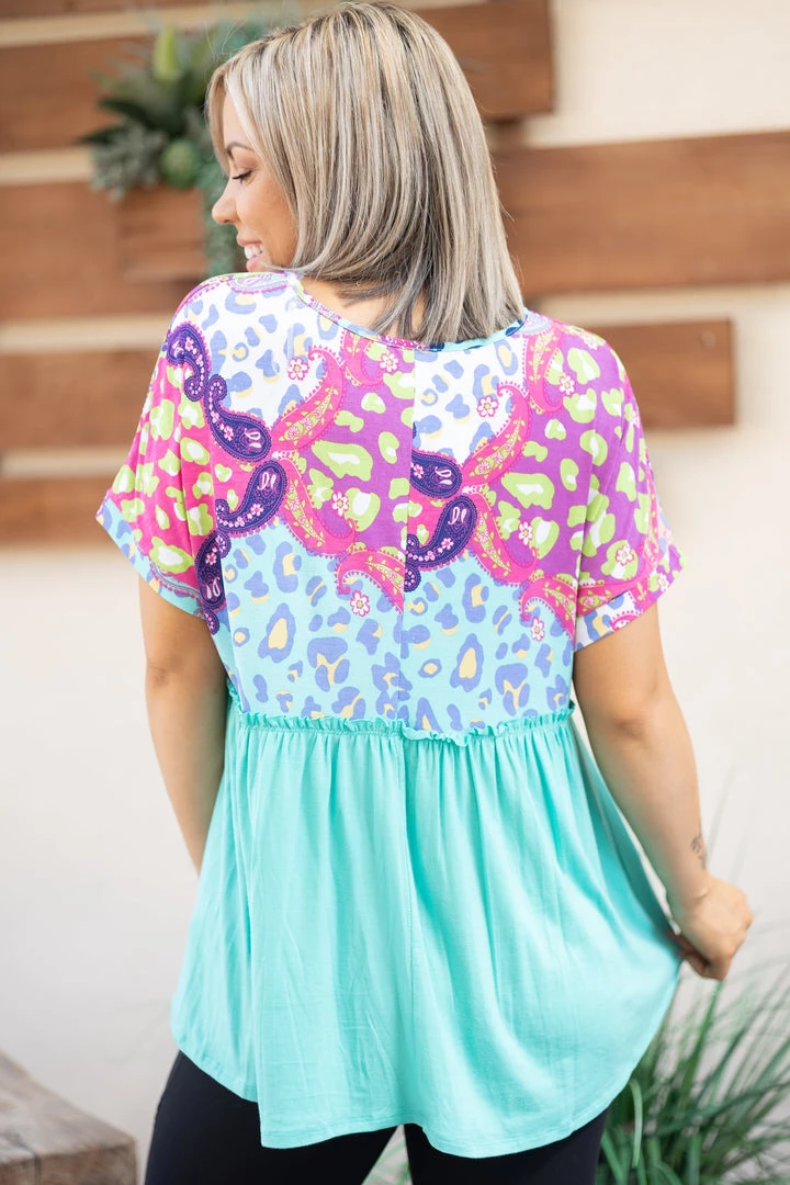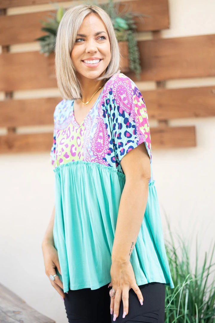There’s no lack of personality with this adorable babydoll. With a relaxed fit, this top features short cuffed sleeeves, v-neck and ruffled peplum hem.