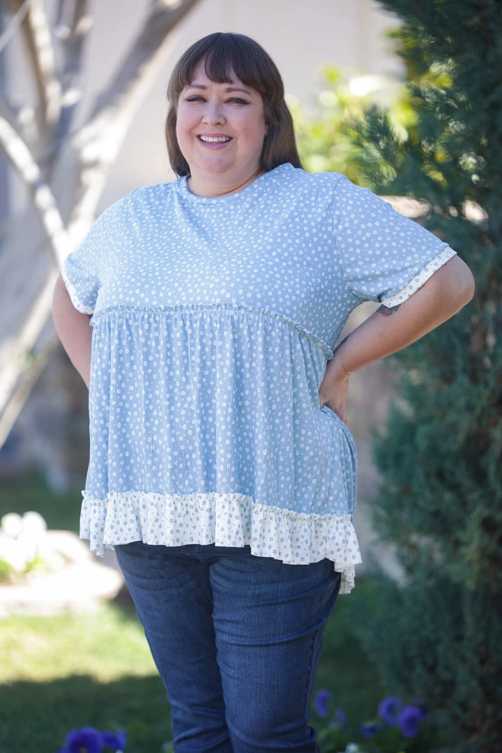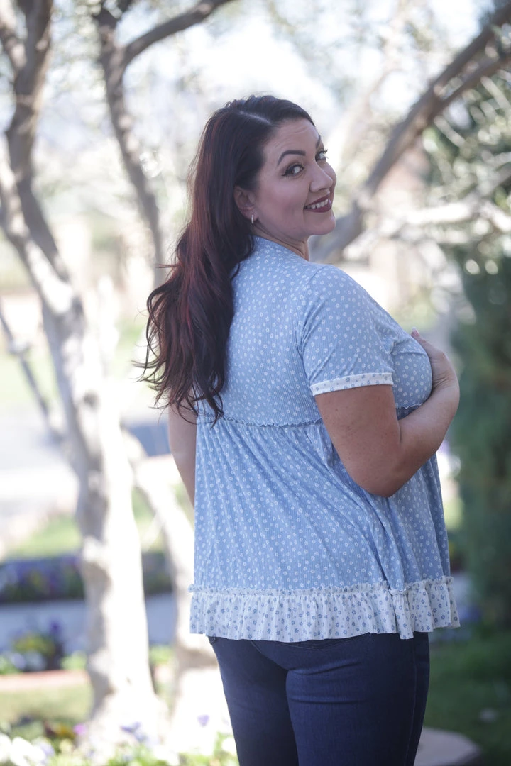 This short sleeve peplum is the perfect denim blue color and that subtle floral print is just darling. With a relaxed fit, this top features a ruffled hem, round neckline and short cuffed sleeves.Β Β Β Β