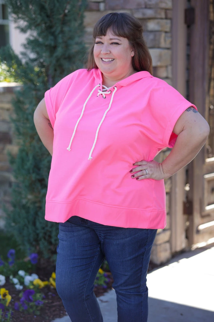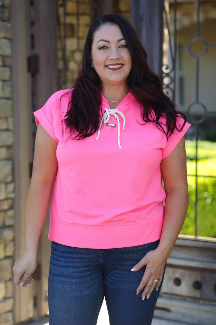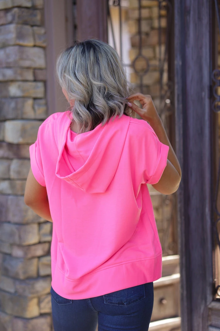No one will ever be able to forget you in this vibrant hot pink short sleeve hoodie. SO perfect to welcome that warm weather in. Made from a soft terry fabric, this hoodie features, a v-neck with shoelace details, short cuffed sleeves, hood andΒ rounded hem.Β Β Β