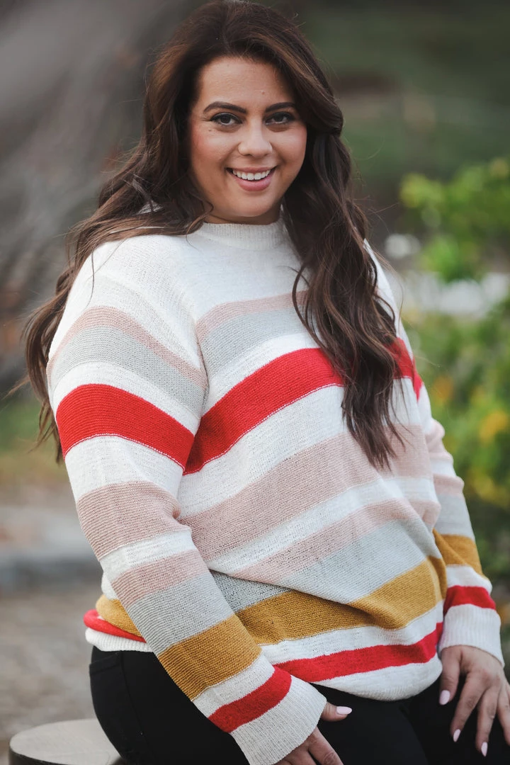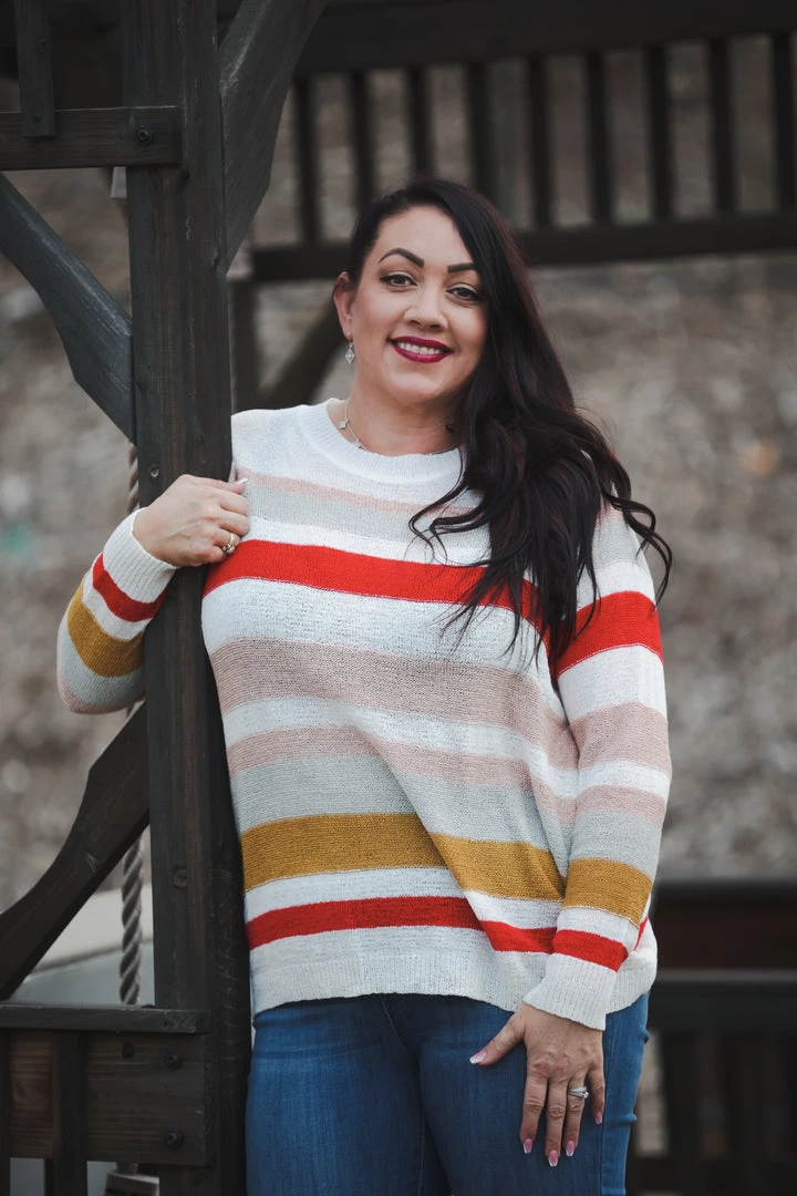 This long sleeve striped pullover is made from the softest loose knit, making it the best transitional pullover of all time. Those vibrant red, mauve and yellow stripes paired with the ivory and grey make for an array of amazing spring colors. With a relaxed fit, this pullover features a round neckline, cuffed sleeves and rounded hem.