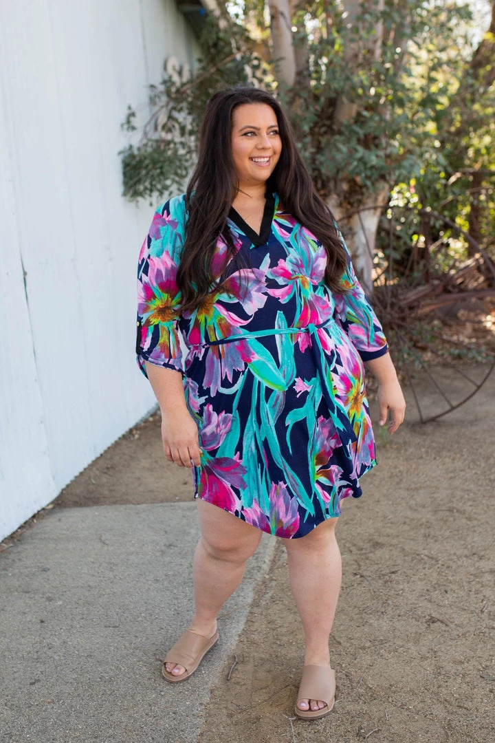 Exotic meets sophistication with this 3/4 sleeve dress. Made from bulgari fabric, this dress features 3/4 roll up button sleeves, a mandarin collar and waist belt detail. You can wear this beauty on it’s own or over a pair of leggings.Β