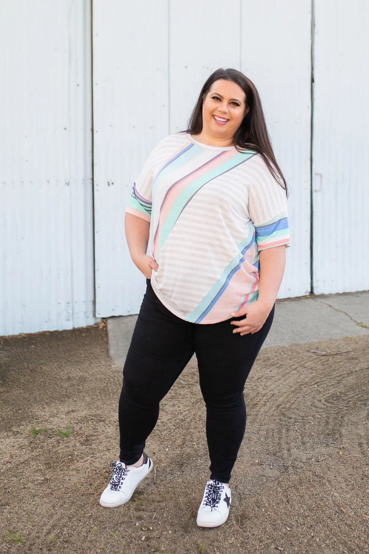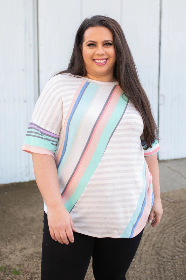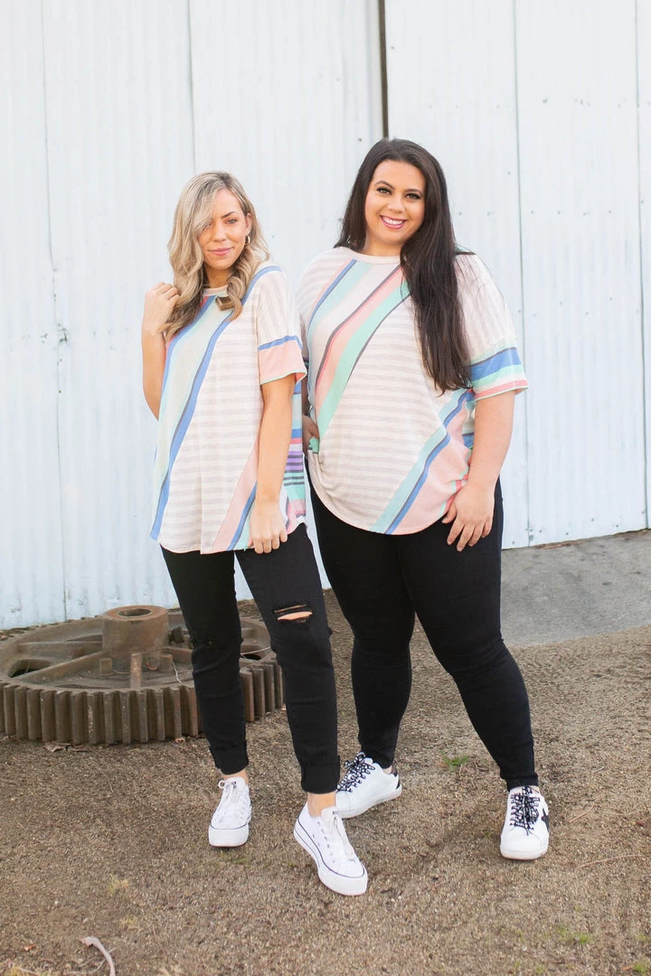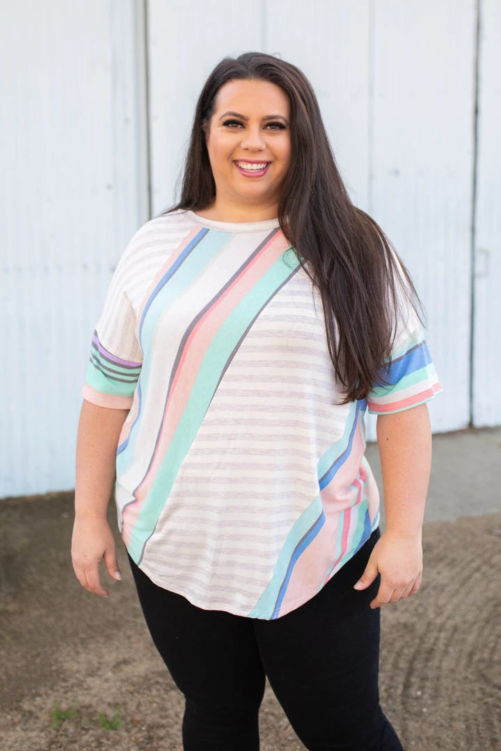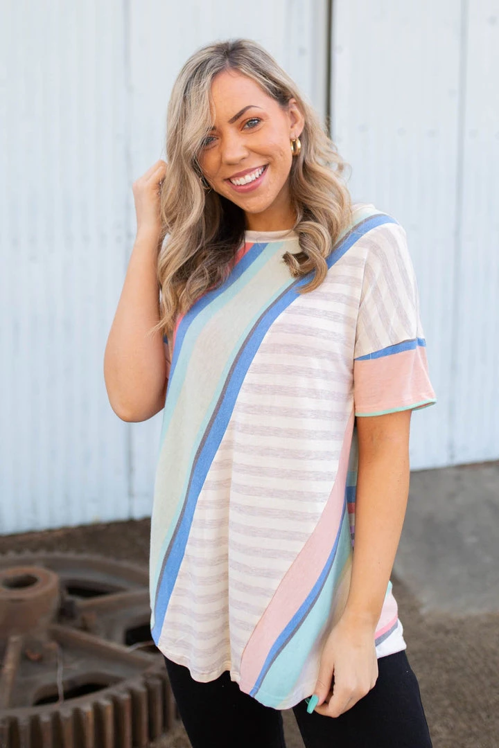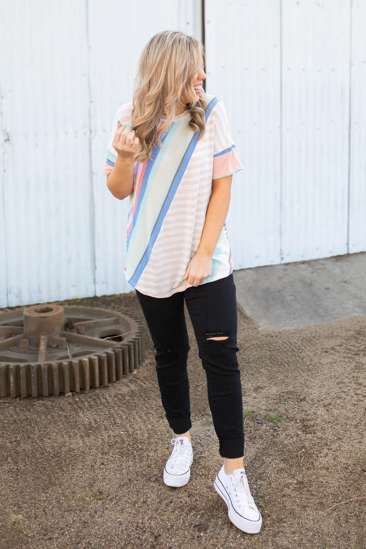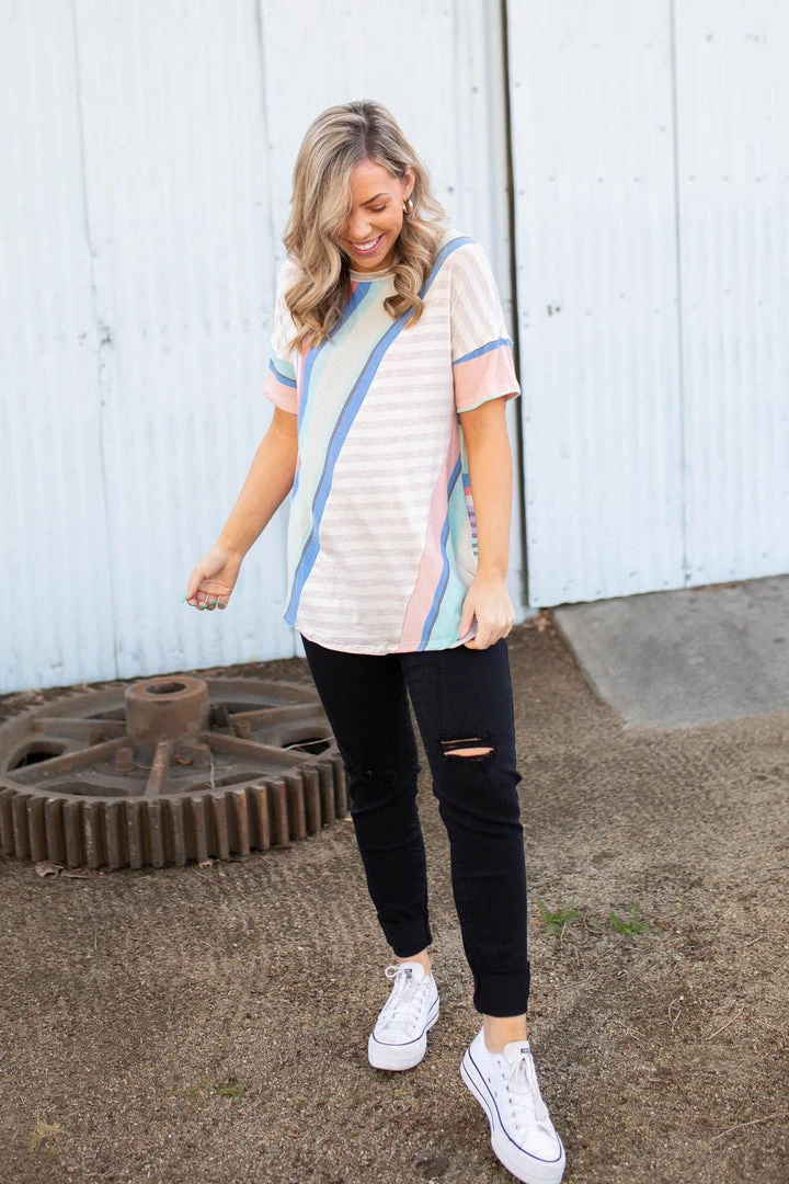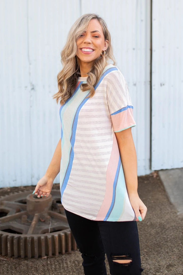 Take a flashback to the 80’s and 90’s in this retro striped short sleeve top. With reminiscent memories of roller skates, this top features a relaxed fit, round neckline, rounded hem and a pleated back detail.Β