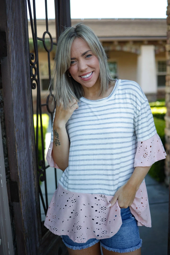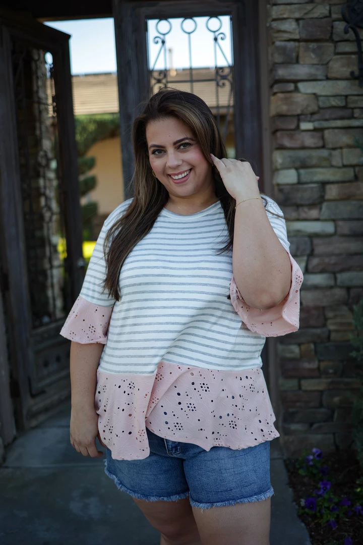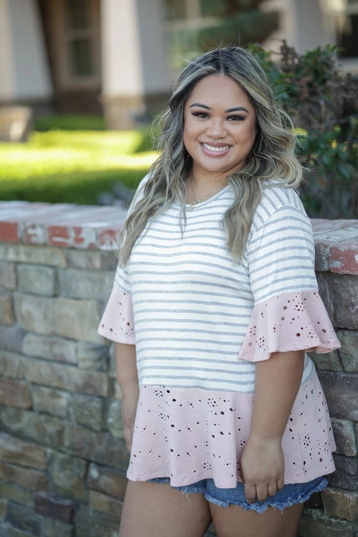 This 3/4 bell sleeve top is giving us those happy flutters. The eyelet ruffle hem has the most intricate floral pattern woven in. With a relaxed fit, this top features a round neckline, and peplum hem.Β Β Β Β Β Β