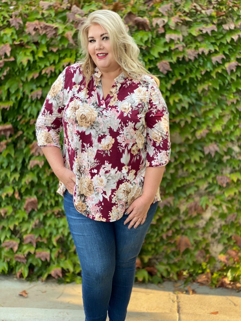 SearchingΒ for the perfect lightweight tunic? Look no further.Β The goldenΒ rose blooms on theΒ burgundyΒ background makes this loose fitting top flattering for all body types. Featuring a banded collar, v-neck and buttoned 3/4 sleeves, this top will make gettingΒ dressed seem effortless.Β