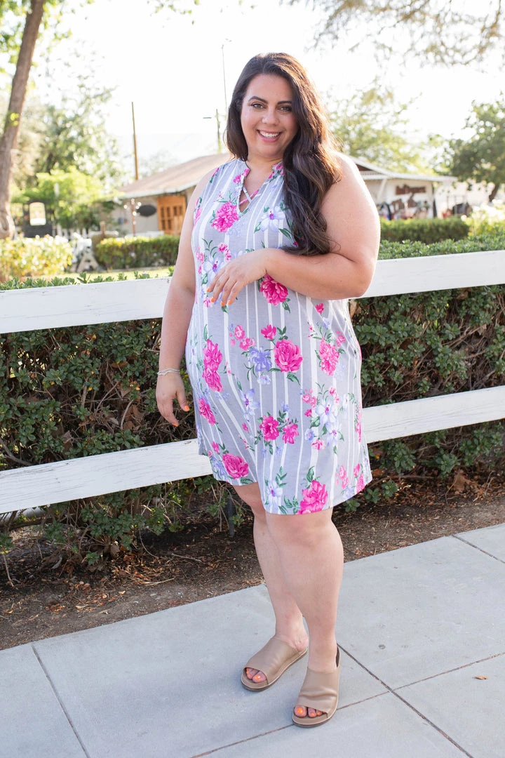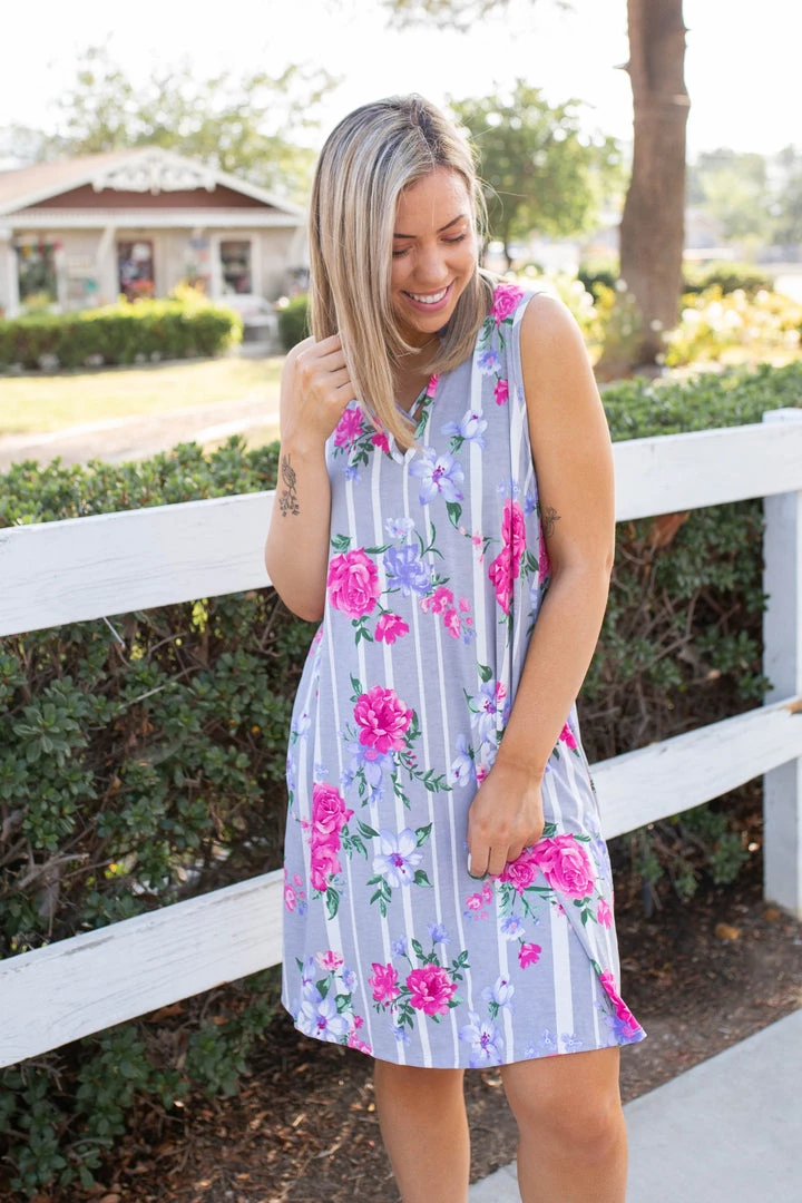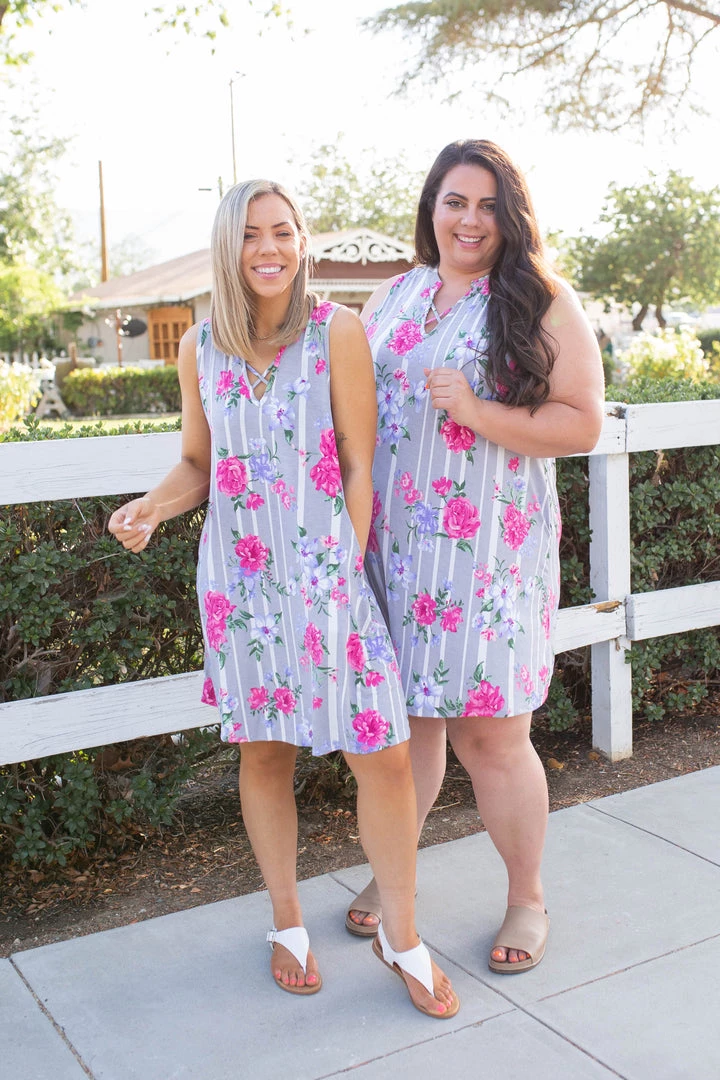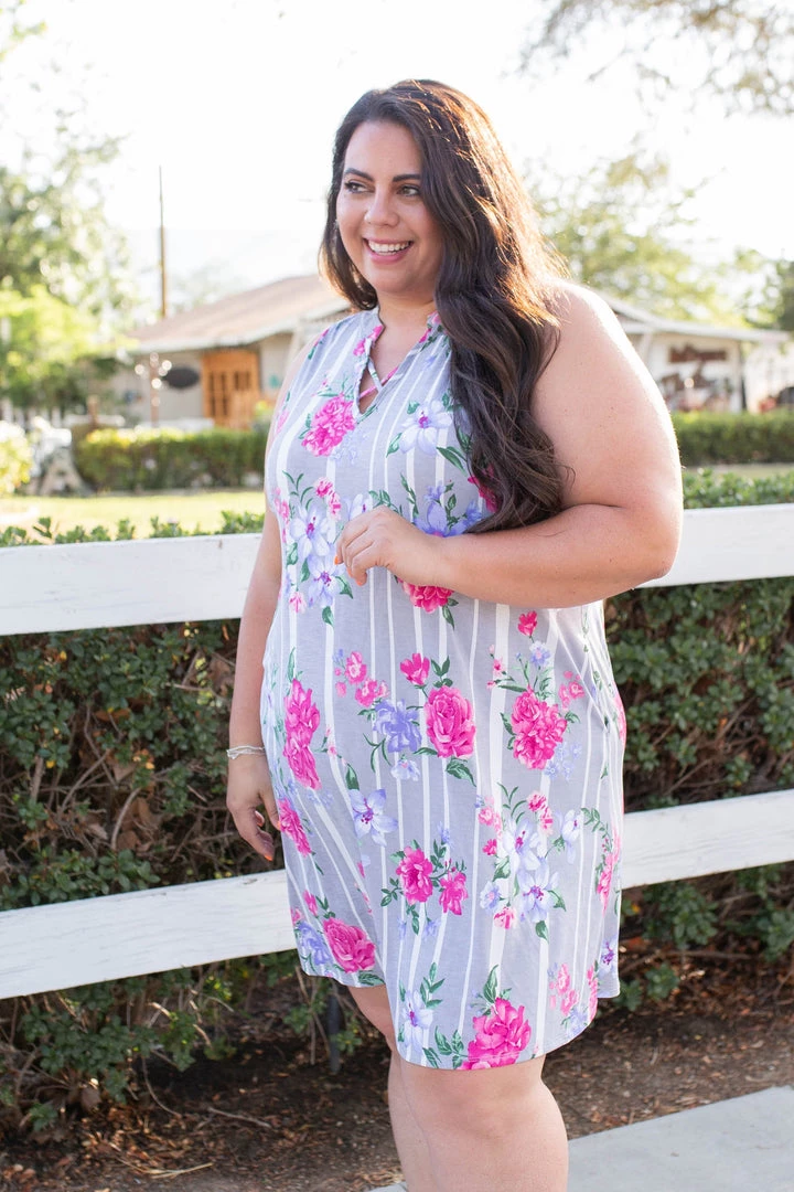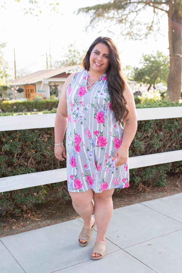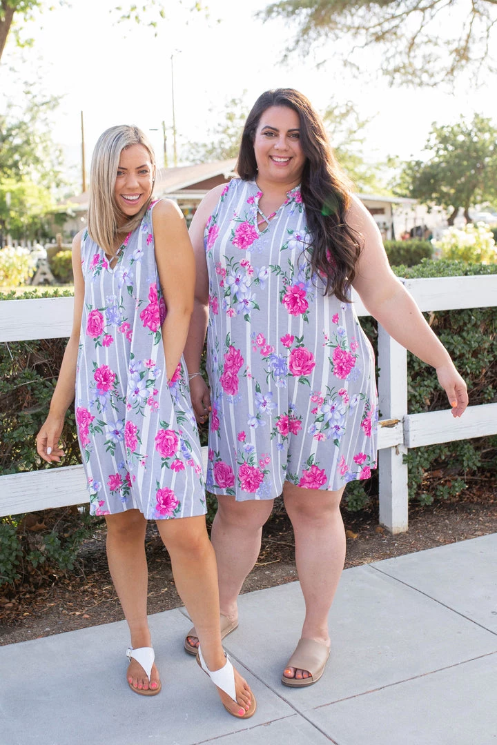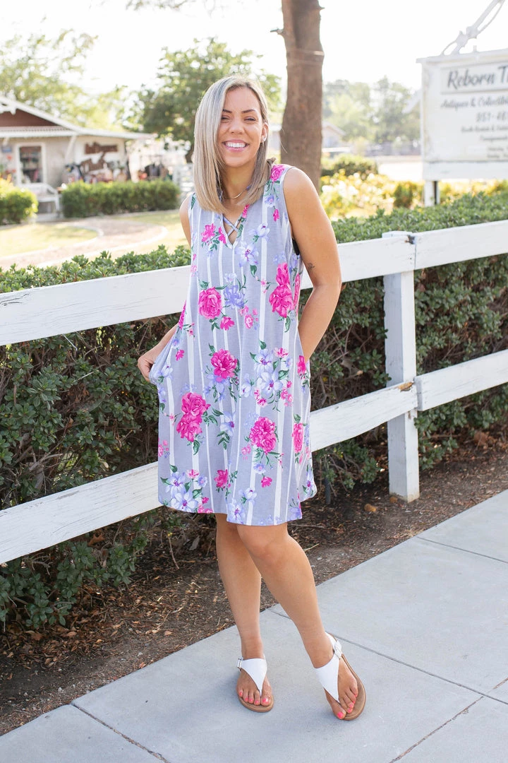 Follow the pathΒ intoΒ Summer and beyond with this gorgeous floral printed,Β tunic dress. That’s right, wear this as either a tunic or dress. Made from bulgari fabric, this sleeveless dress features side pockets and a v-neck with criss cross details.Β