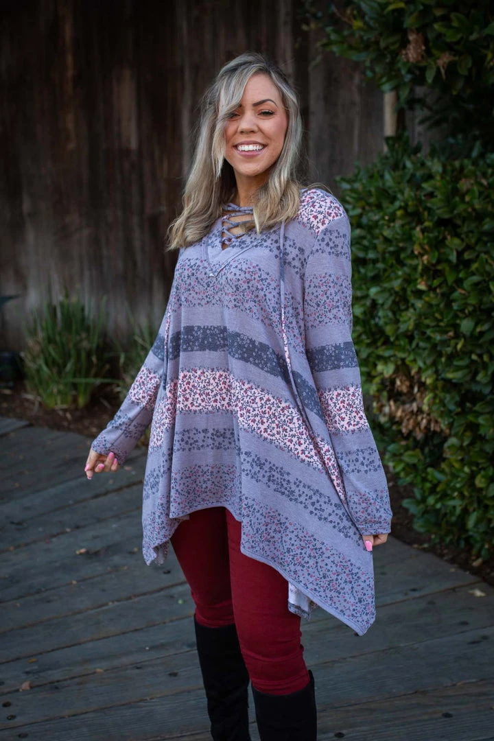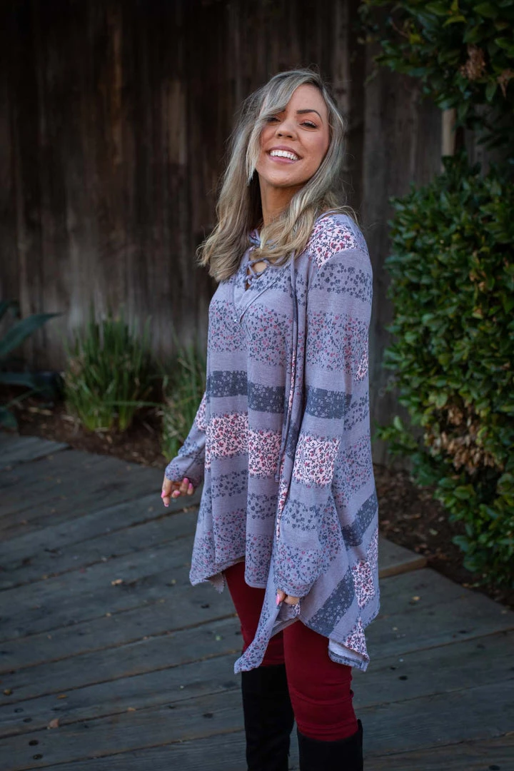 We are loving this long sleeve tunic. The floral stripes are perfect for any season! Featuring a sharkbite hem, loose fit and lace up neck detail, this top will pair perfect leggings or skinnies.Β Β Β Β