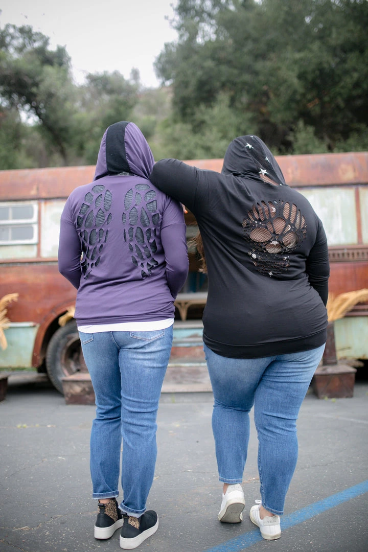 Let this zip up hoodie take you anywhere your heart desires. The angel wing laser cutout on the back over the mesh detailing, really gives this piece a unique look. With a relaxed fit, this top features long sleeves, front zipper and kangaroo pockets.Β