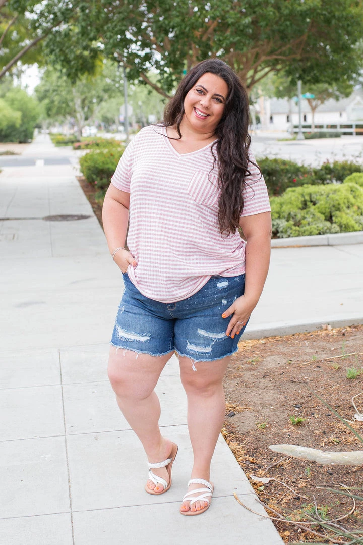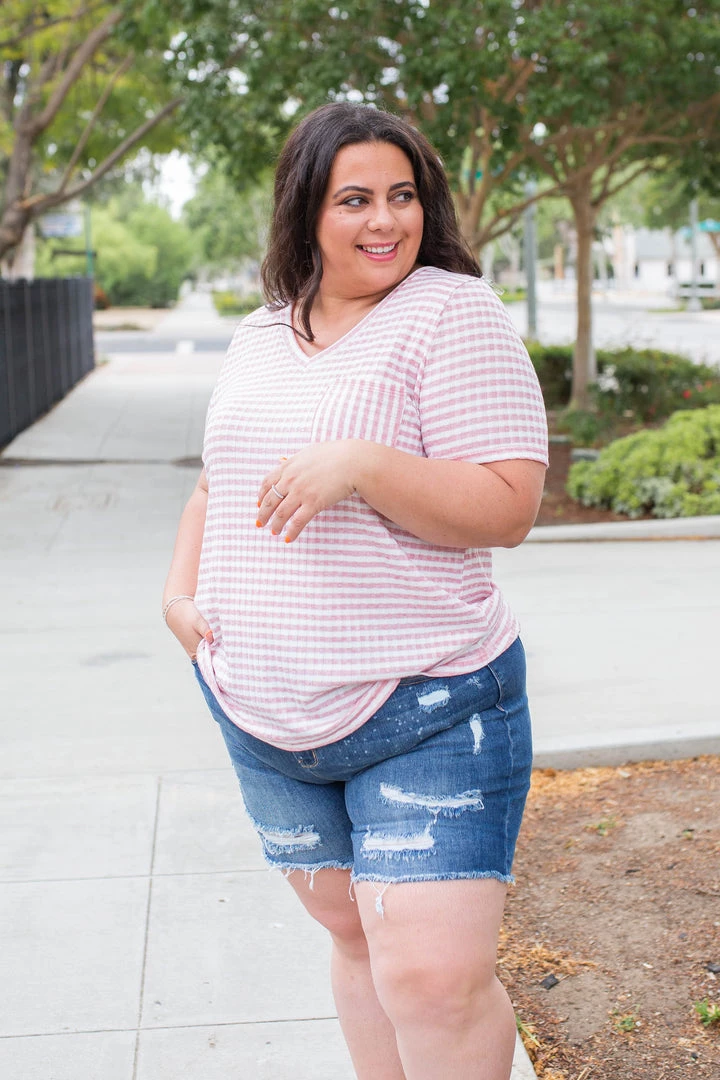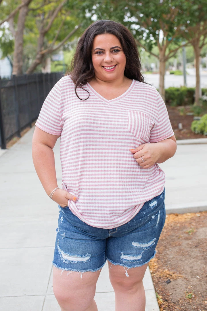 Like delicious good & plenty candies, this boyfriend top is just as yummy. Made from a lightweight slub ribbed fabric, this top features short sleeves, v-neck and front pocket detail.Β