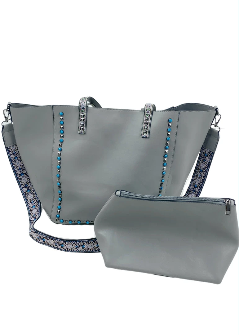 This tote bag is the perfect weekender bag. The large size can accommodate so many necessities and there is a second pouch bag that can be used to easily store all your essentials for easy access. We are head over heels for the bead detailing and the embroidered stitching on the straps that resemble guitar straps.ย