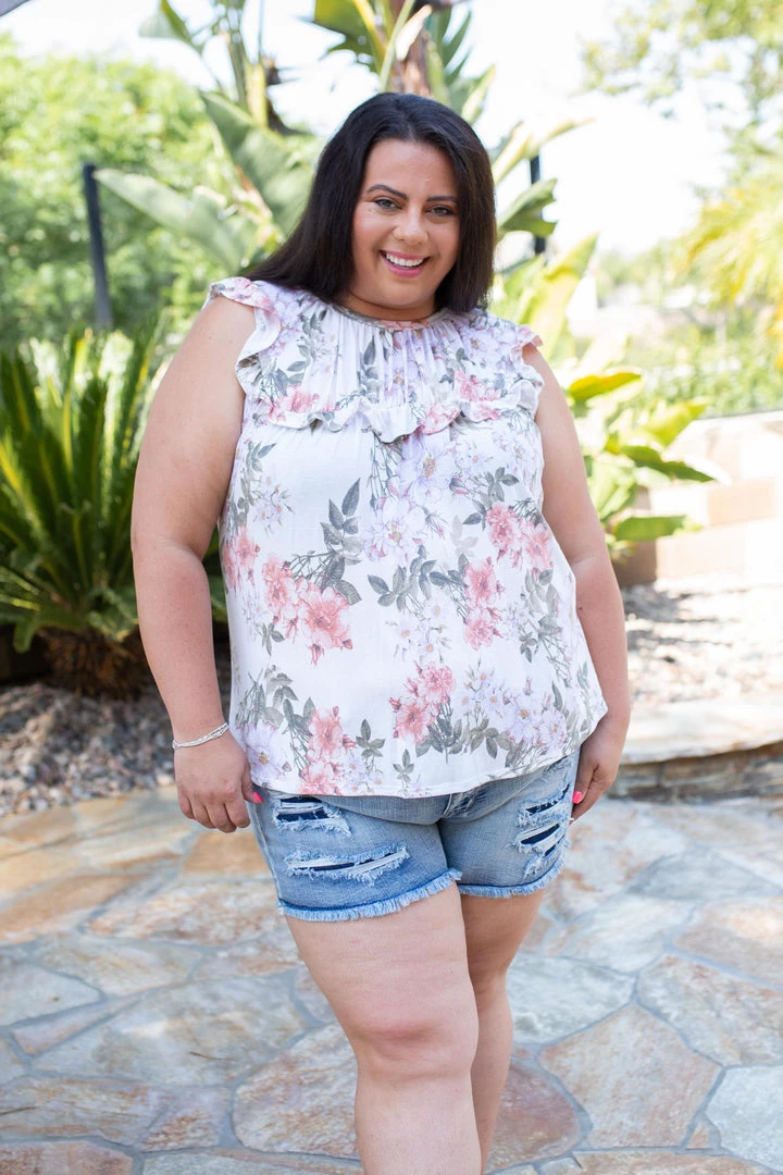 We are obsessing over this gorgeous floral printed sleeveless top! Such a great piece to dress up or down with, talk about versatility! With a relaxed fit, this top features a round neckline with ruffle detail and a rounded hem.Β Β Β Β