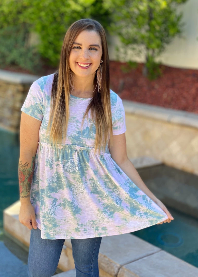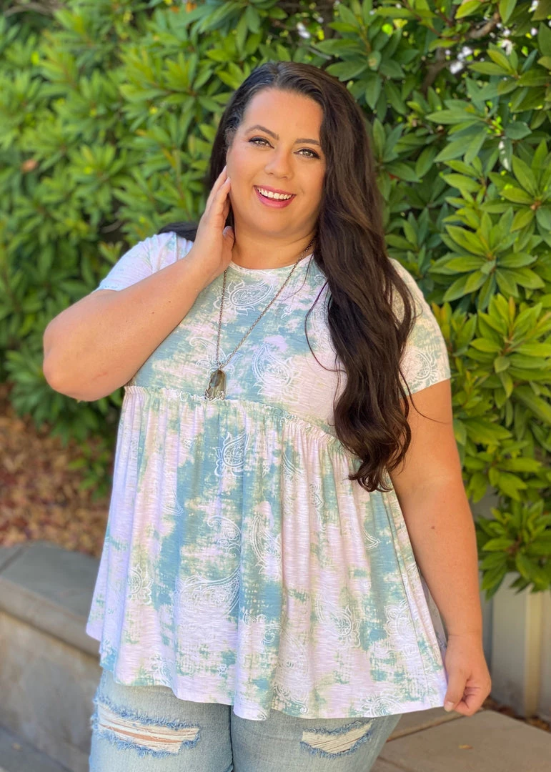Honey Me has outdone themselves again with this gorgeous short sleeve babydoll top. There is just a hint of paisley amongst the sage brushed tie dye. Featuring a relaxed fit and rounded neckline, this one is a must have!Β Β