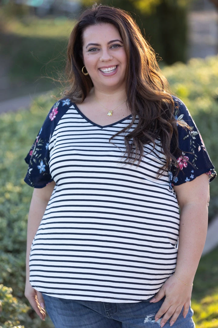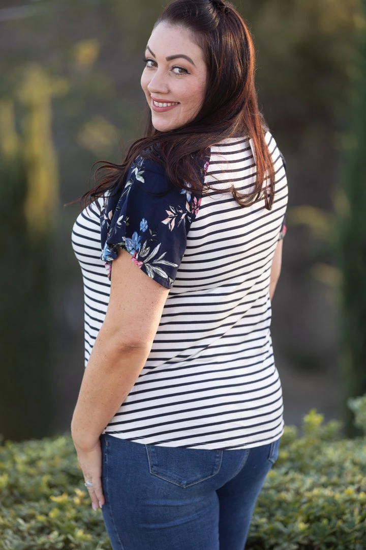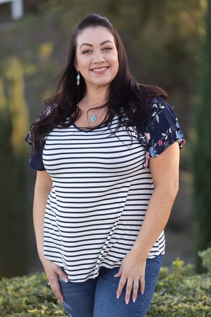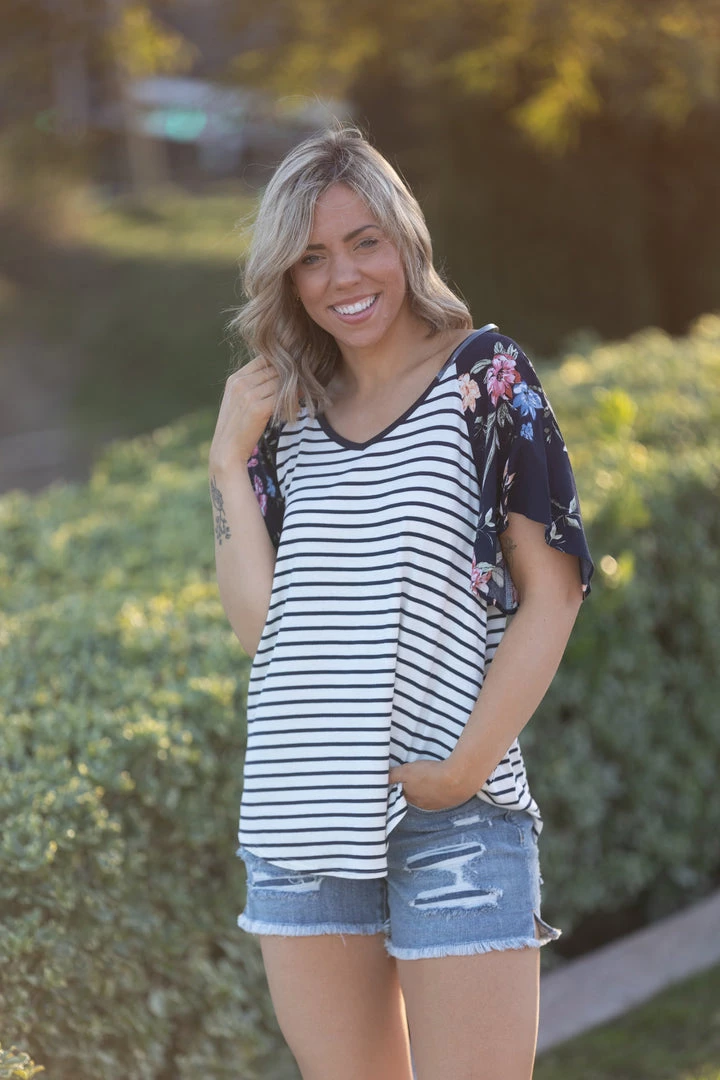 There is no way to measure the amount of joy that this striped and floral ruffle sleeve will bring to you. With a relaxed fit, this top features a v-neck, short flare sleeves and rounded hem.