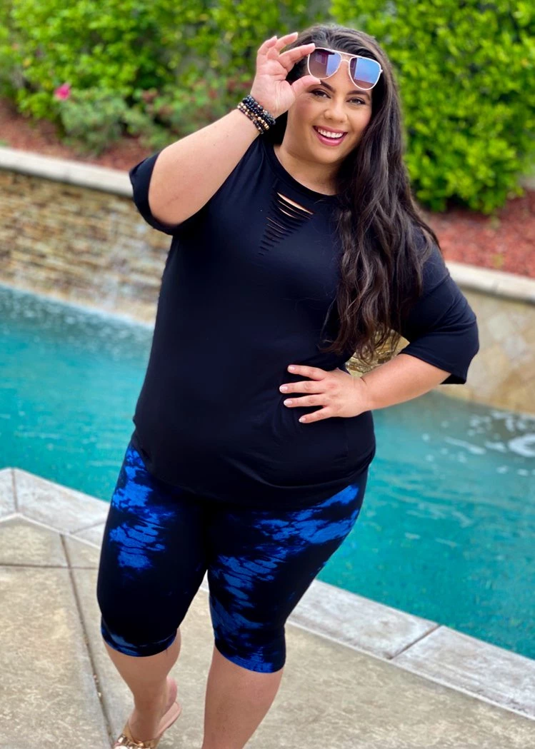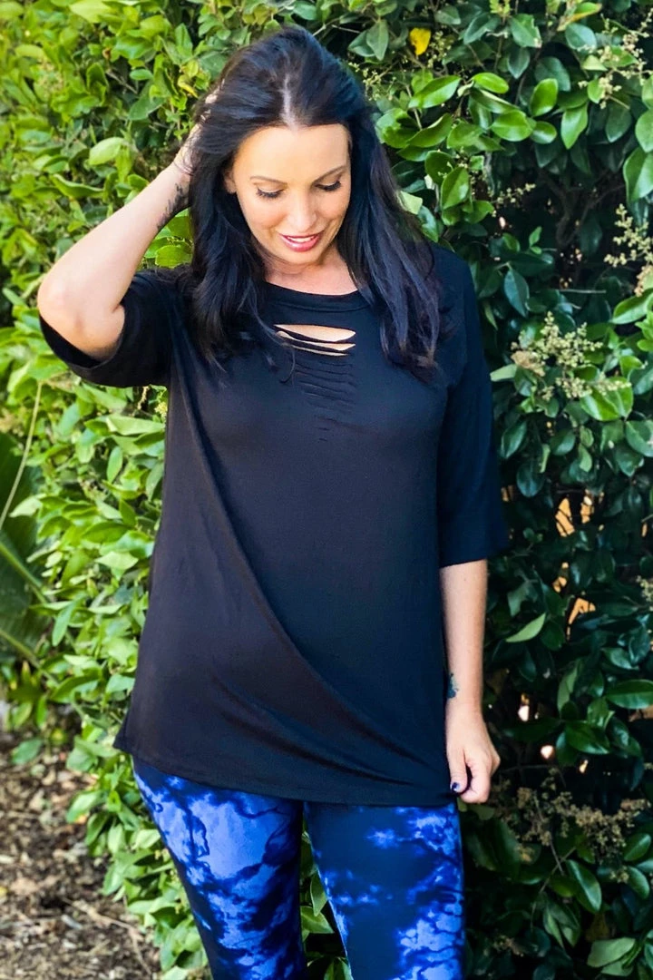 No one can own enough tunics, and especially black at that! We love the unique look of this one. Featuring a laser cut v, oversized relaxed fit and short sleeves.
