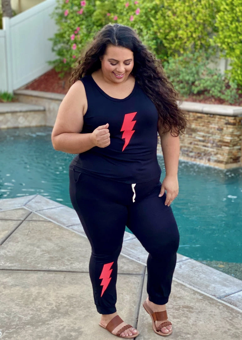Whether you’re lightning fast or not, you’ll feel like you are in this ultra comfortable jogger set. Best part, mix and match the pieces with your current wardrobe for endless opportunities! The tank features no fuss straps (wear it with any bra), scoop neck and a relaxed fit. The joggers feature banded cuff legs, drawstring elastic waist and pockets!
