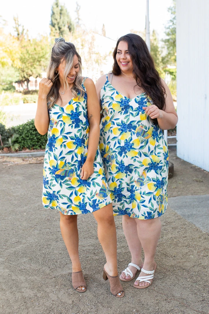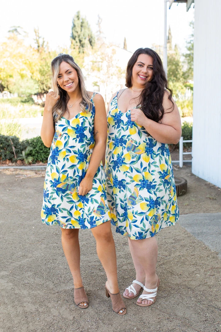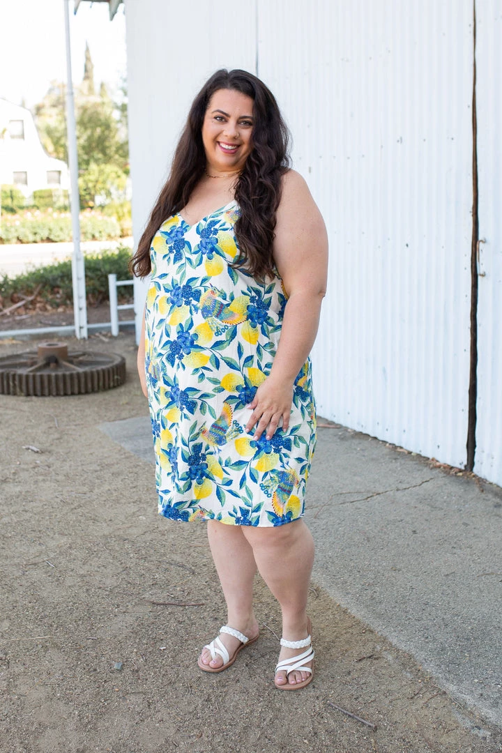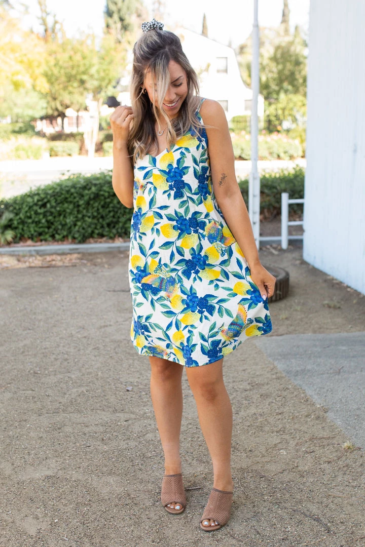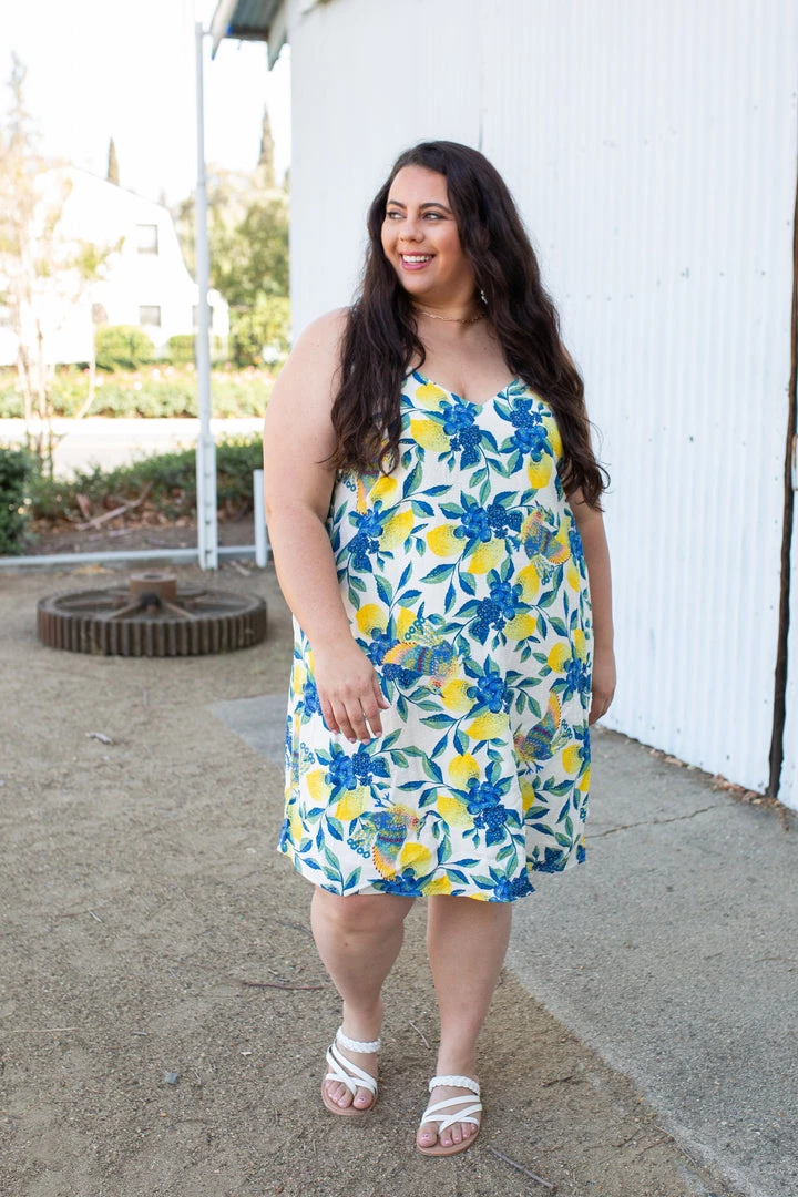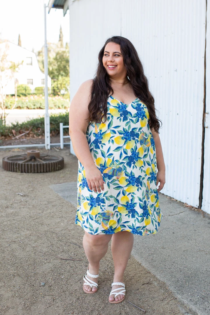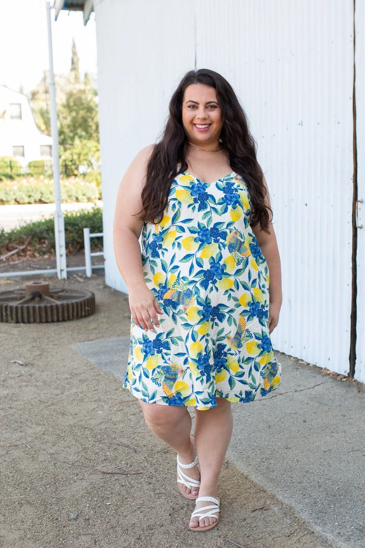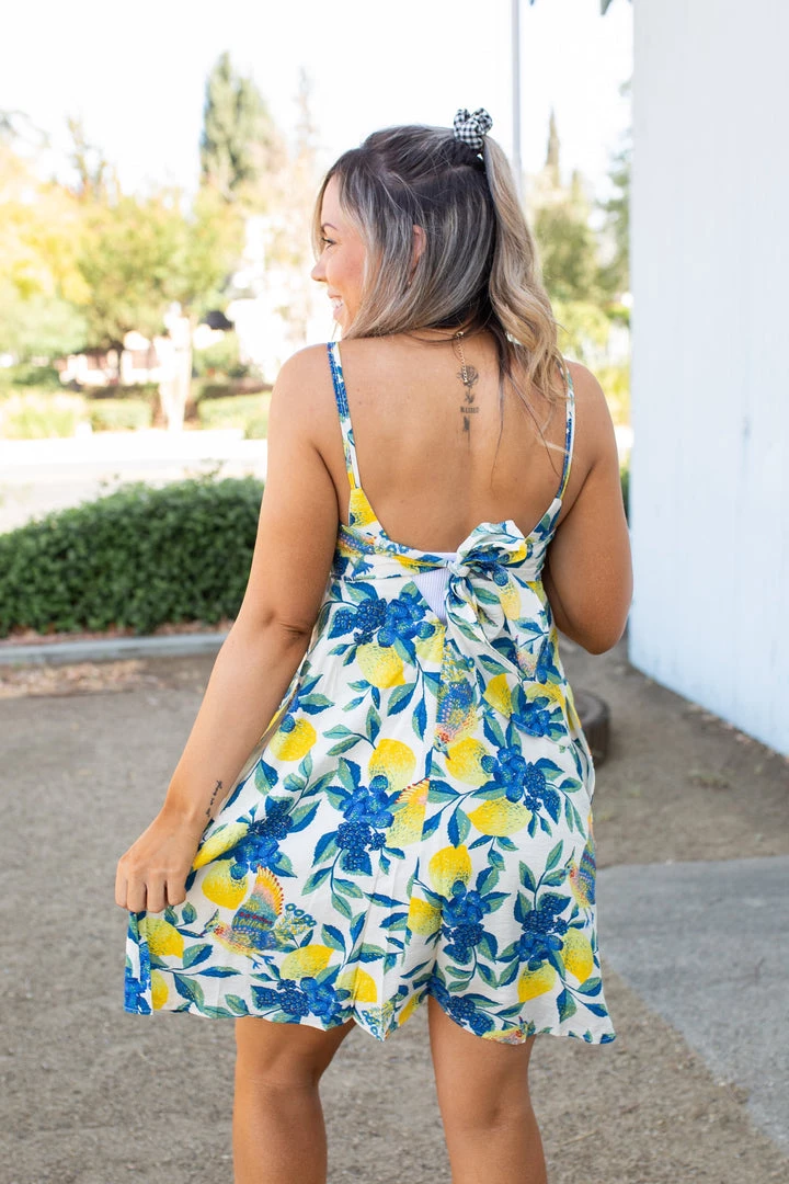 Like fresh squeezed lemons, this dress is as fresh as it gets. Seriously the perfect summer print with the lemons, berries and birds. With a relaxed fit, this dress has a self close tie in the back so you can really make it fit your body best. This dress is lined to perfection so there is nothing sheer about it, and it also has pockets!Β