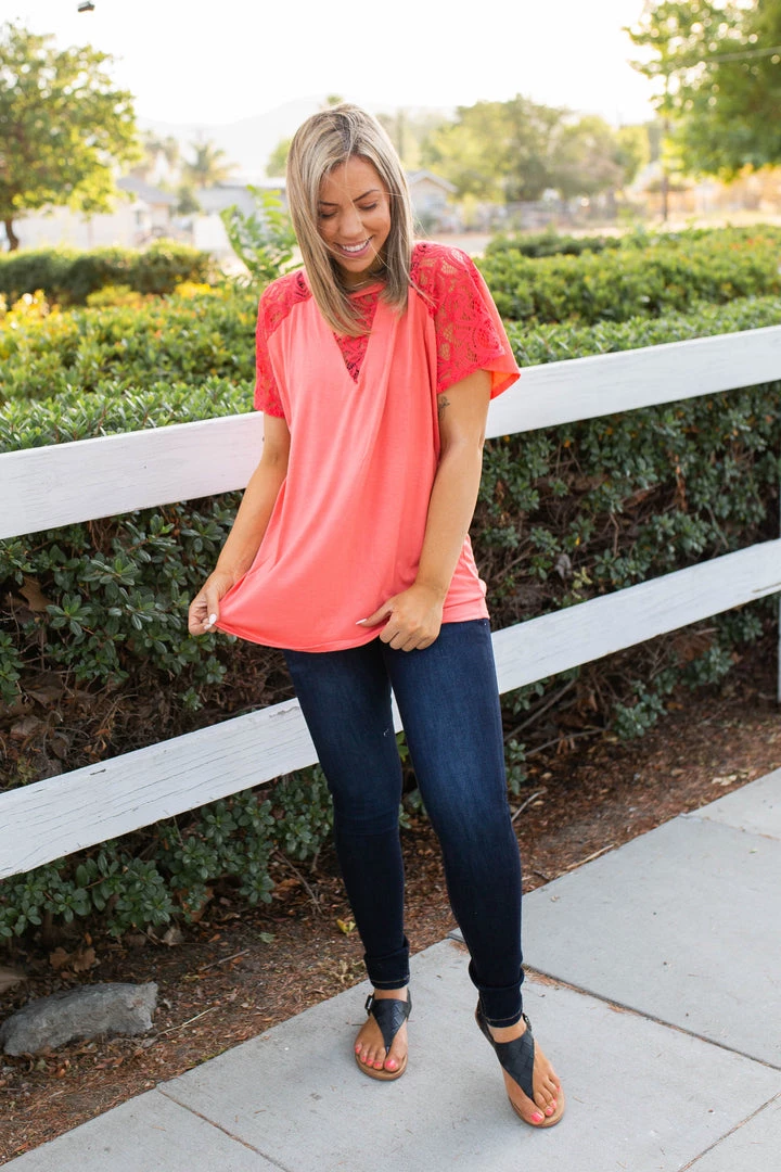 This top is the best of both worlds. Feels like you’re wearing a tank, but looks like you’re wearing a tee. So perfect for those warmer days. With a relaxed fit, this coral top features a round neckline with v-neck lace detail, and short lace raglan sleeves.Β Β