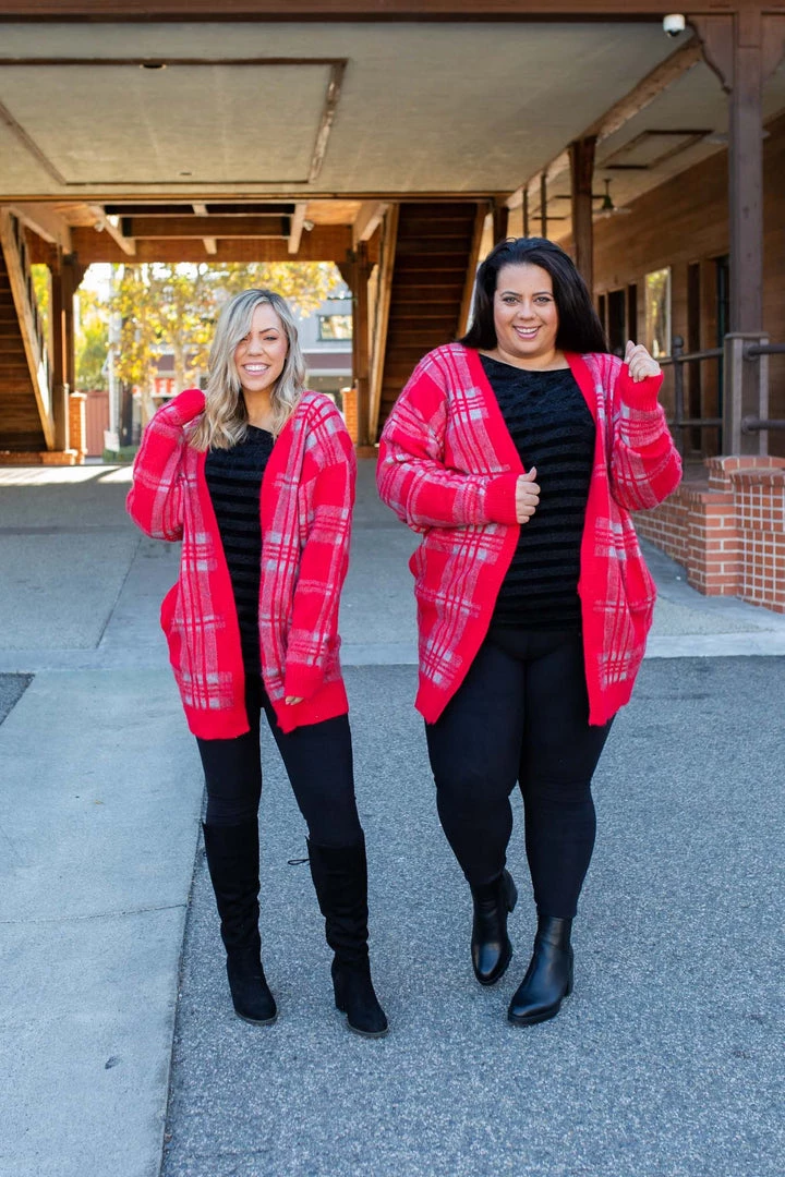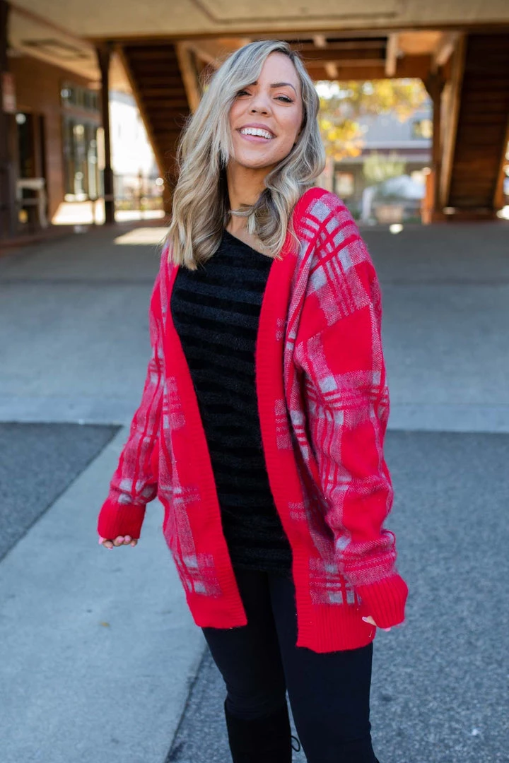 We are absolutelyΒ mad about plaid and this long sleeve knit cardigan takes the cake.Β Not only is it extremely soft and cozy, but it features an open front with ribbed hem detail and a relaxed fit.Β