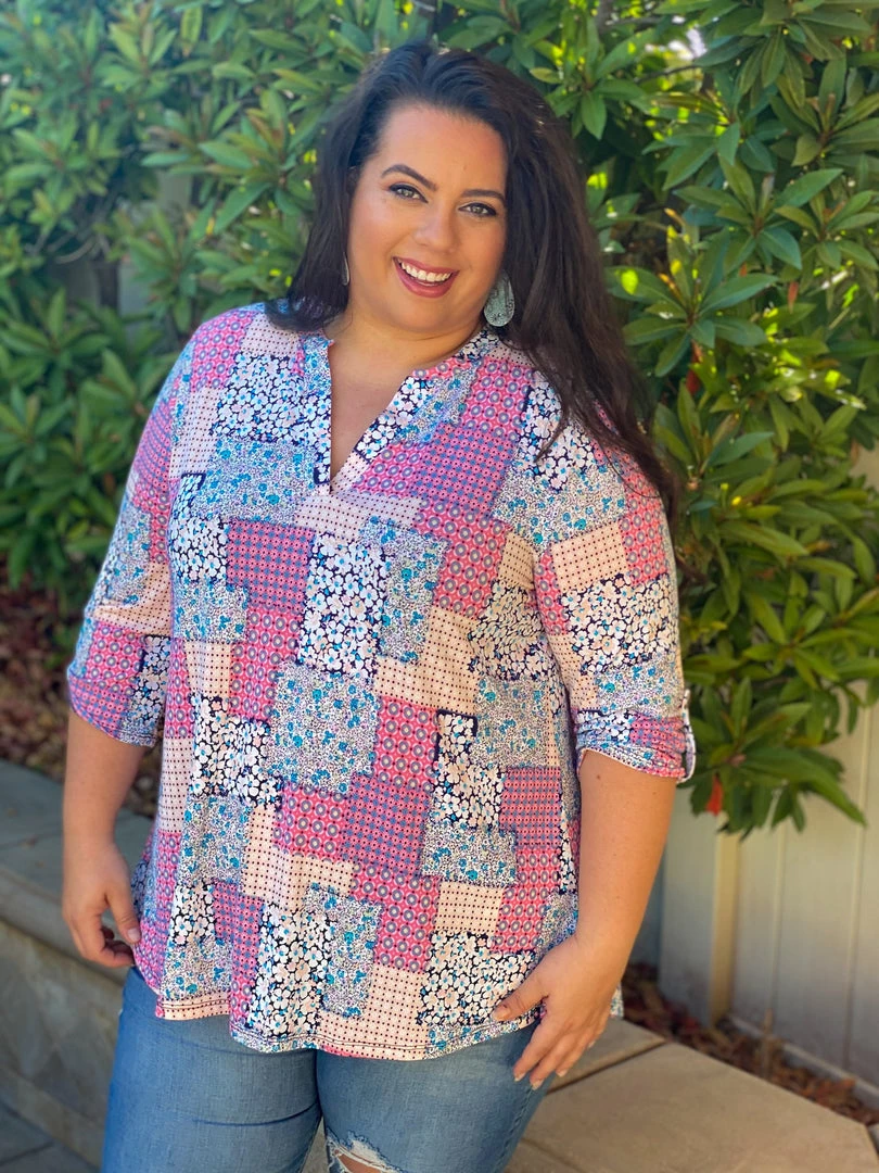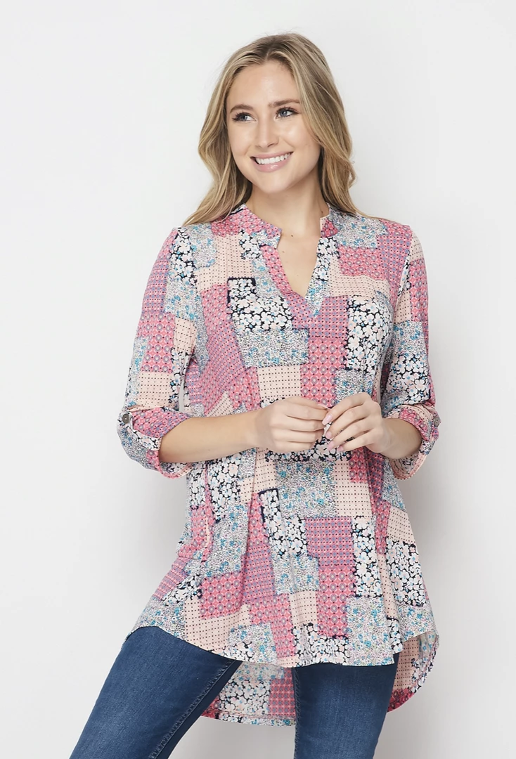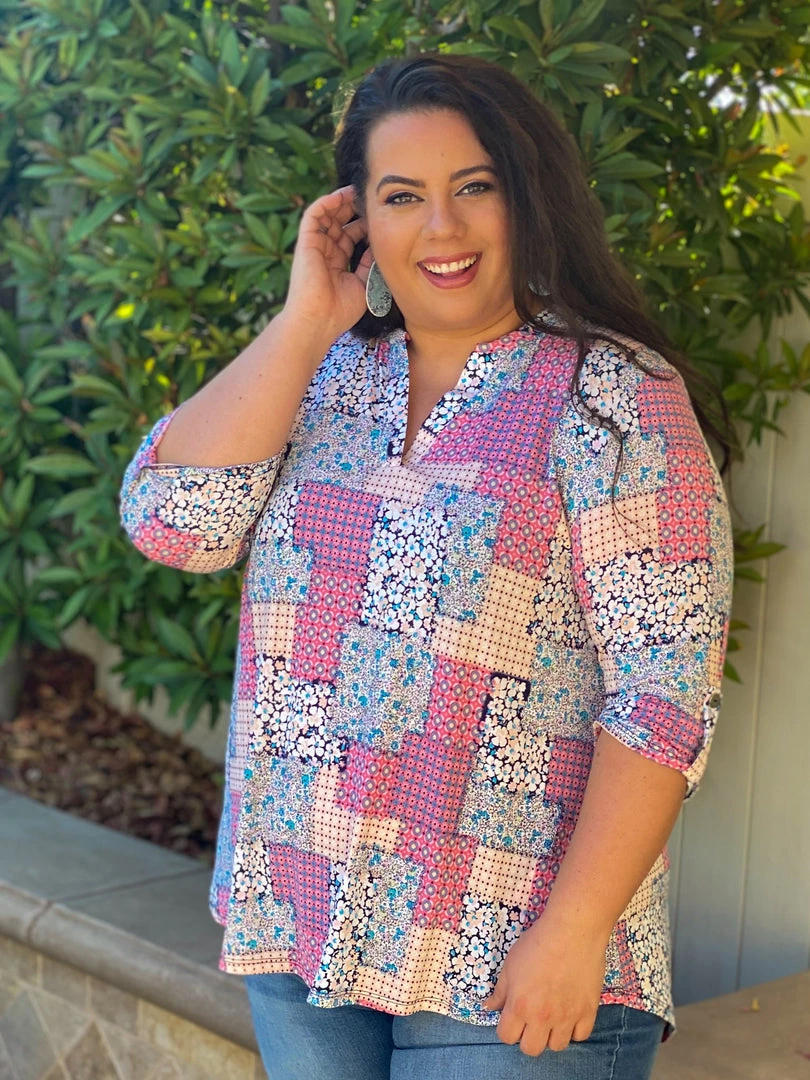 SearchingΒ for the perfect lightweight tunic? Look no further.Β TheΒ patchwork makes this loose fitting top flattering for all body types. Featuring a banded collar, v-neck and buttoned 3/4 sleeves, this top will make gettingΒ dressed seem effortless.Β