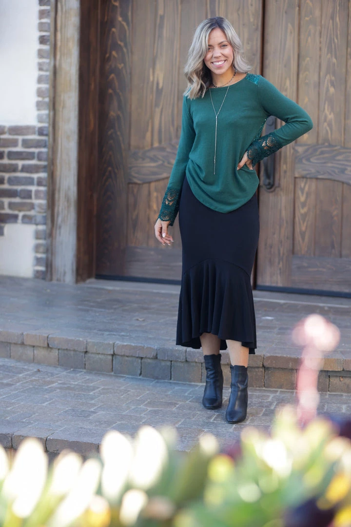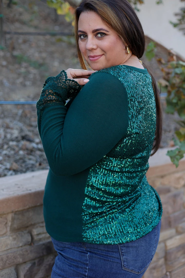 Make every day or night memorable with this gorgeous lace cuffed long sleeve. With a structured fit, this top features a round neckline, long sleeves and sequence back panel.