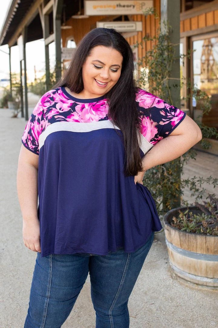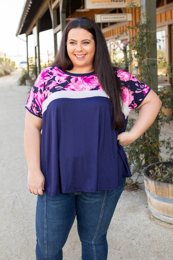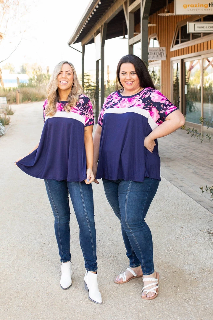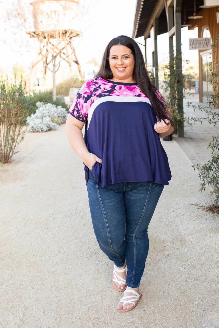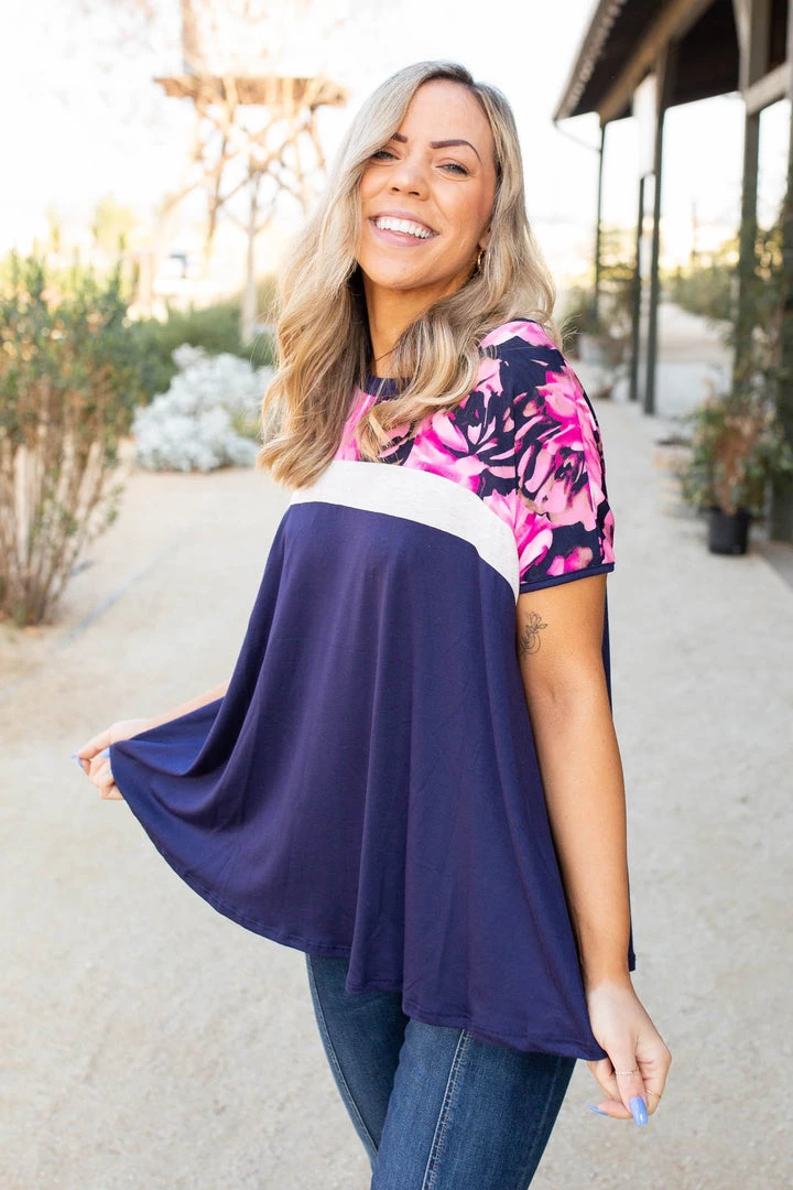 This colorblock top is sheer perfection. With a navy base, this top features short sleeves, a round neckline and relaxed fit.Β Β Β Β Β Β