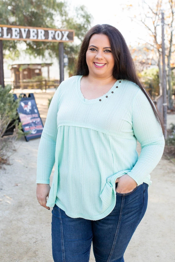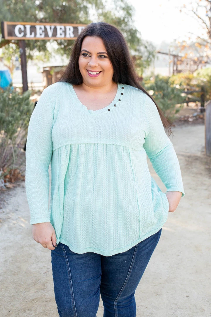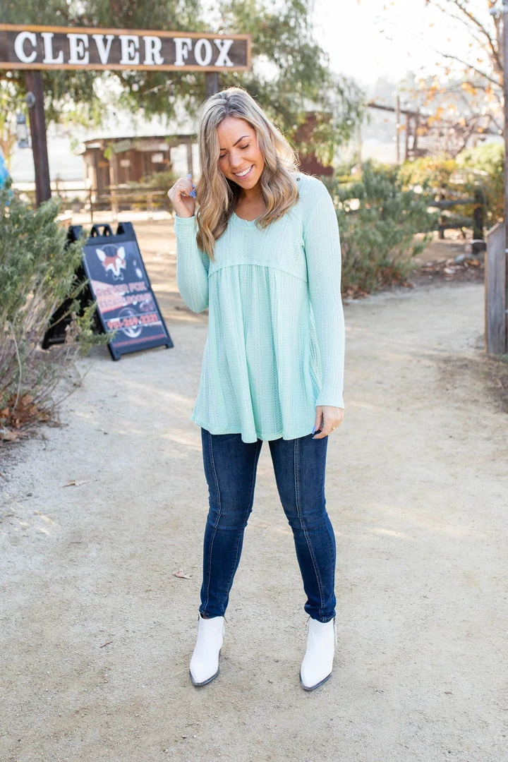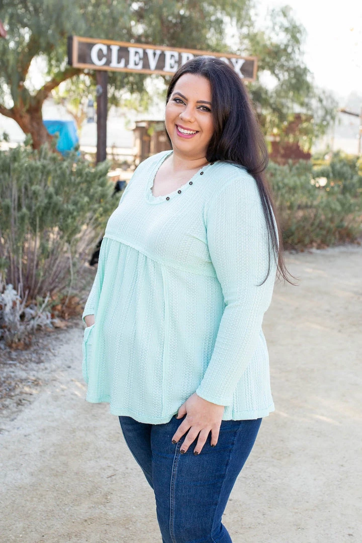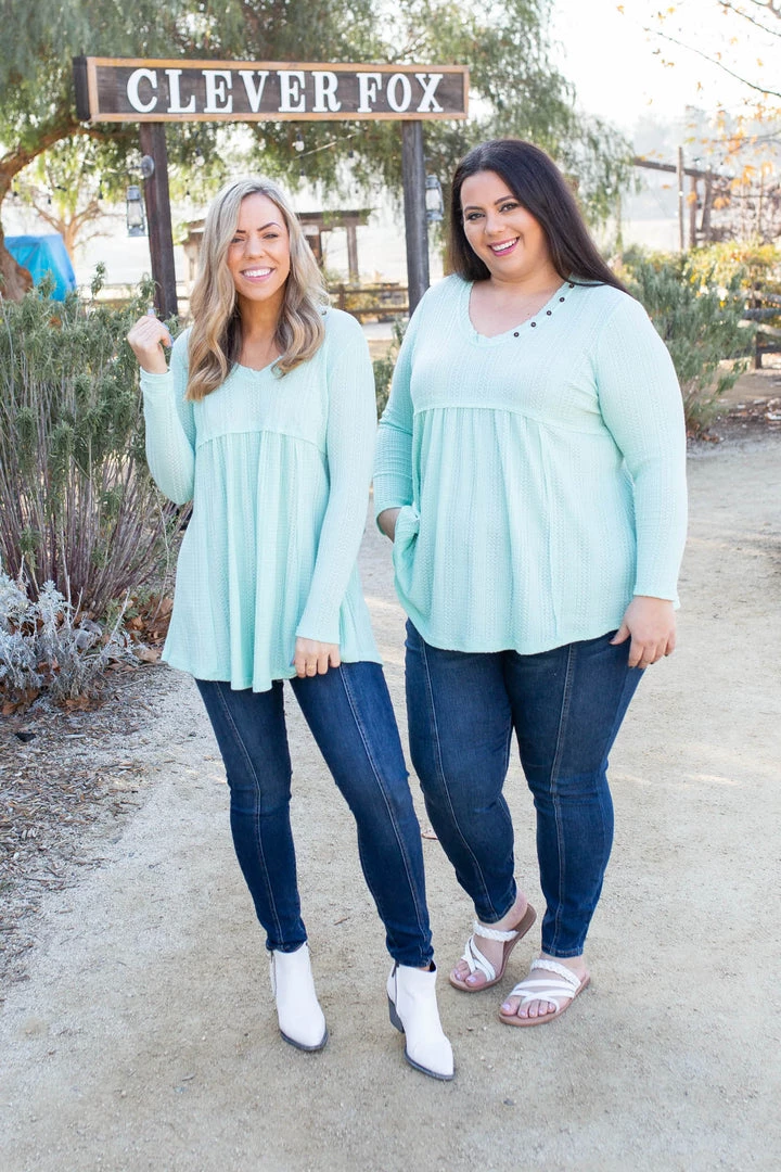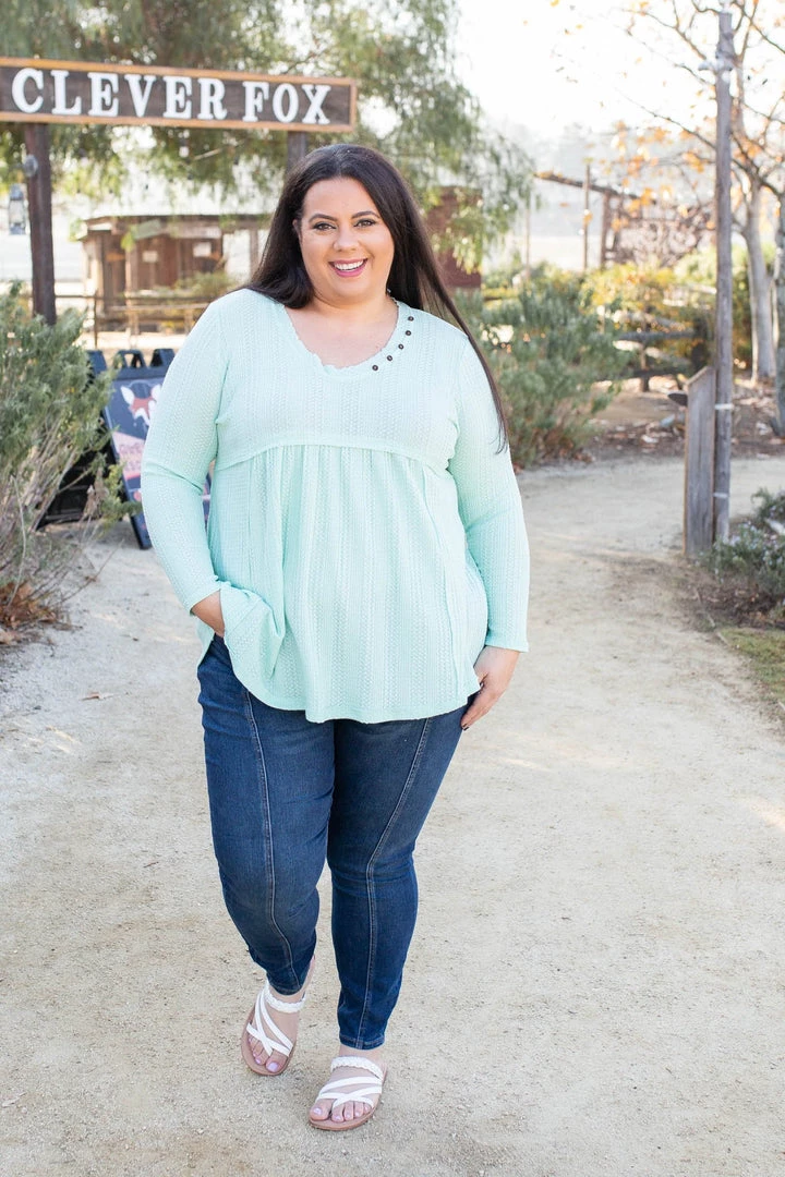 This solid knit fabric babydoll top is the most amazing top in all the land. Not only is the fit absolute perfection, but it also features long sleeves, a scoop neck, shirred pleated waist, high low tunic length and button trim on the neckline.