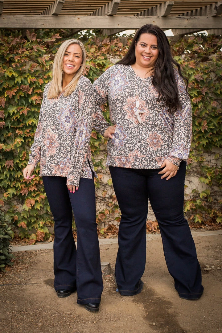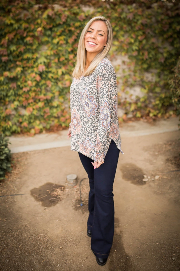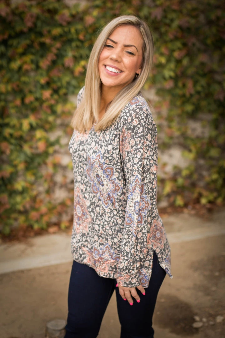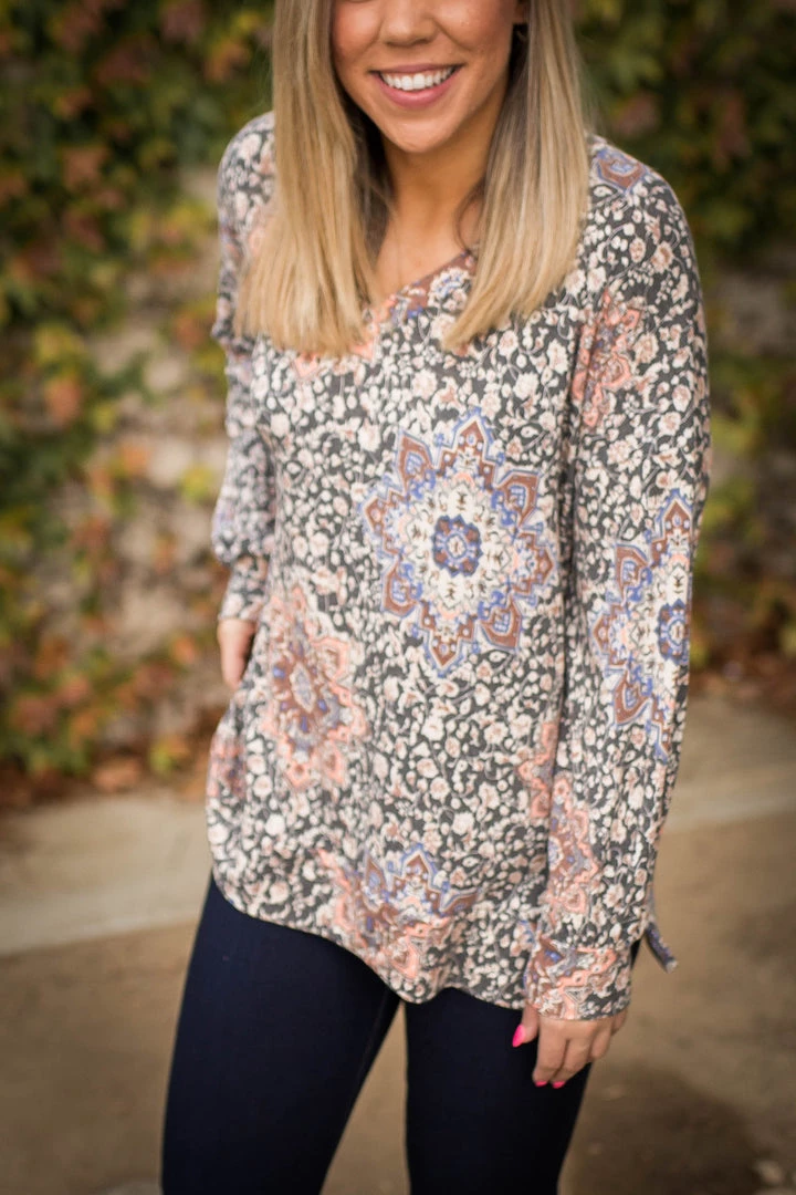 This mosaic printed long sleeve top is sure to turn heads.Β Β FeaturingΒ long sleeves, aΒ v-neckΒ andΒ side slit hem and sleeves.Β Β Β Β