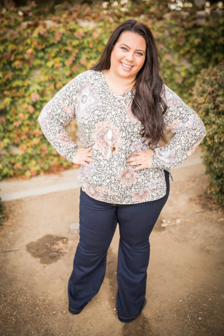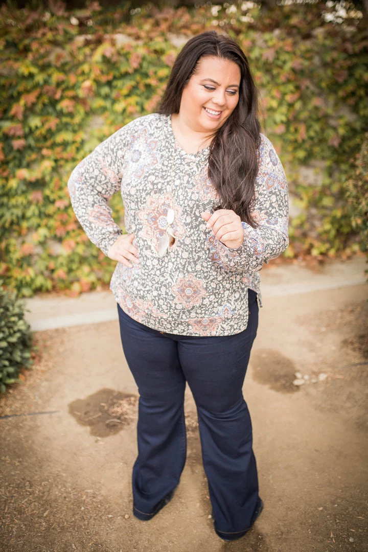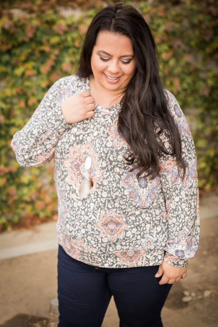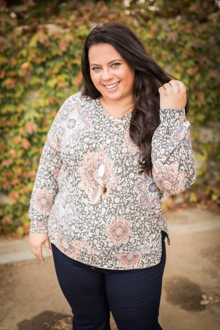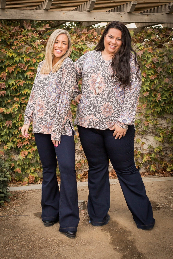 This mosaic printed long sleeve top is sure to turn heads.Β Β FeaturingΒ long sleeves, aΒ v-neckΒ andΒ side slit hem and sleeves.Β Β Β Β
