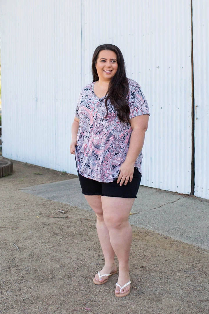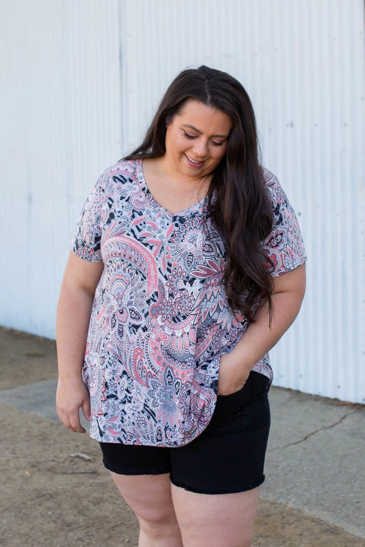 The paisley pattern in this short sleeve top is one of a kind. With a relaxed fit, this top features short sleeves, a v-neck and rounded hem.
