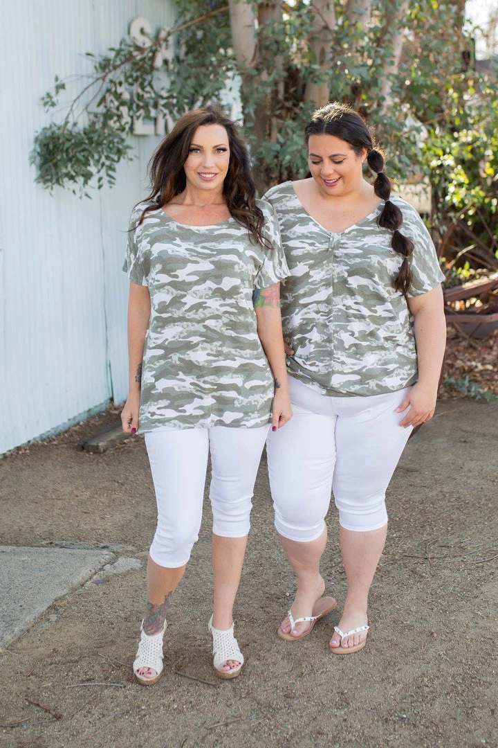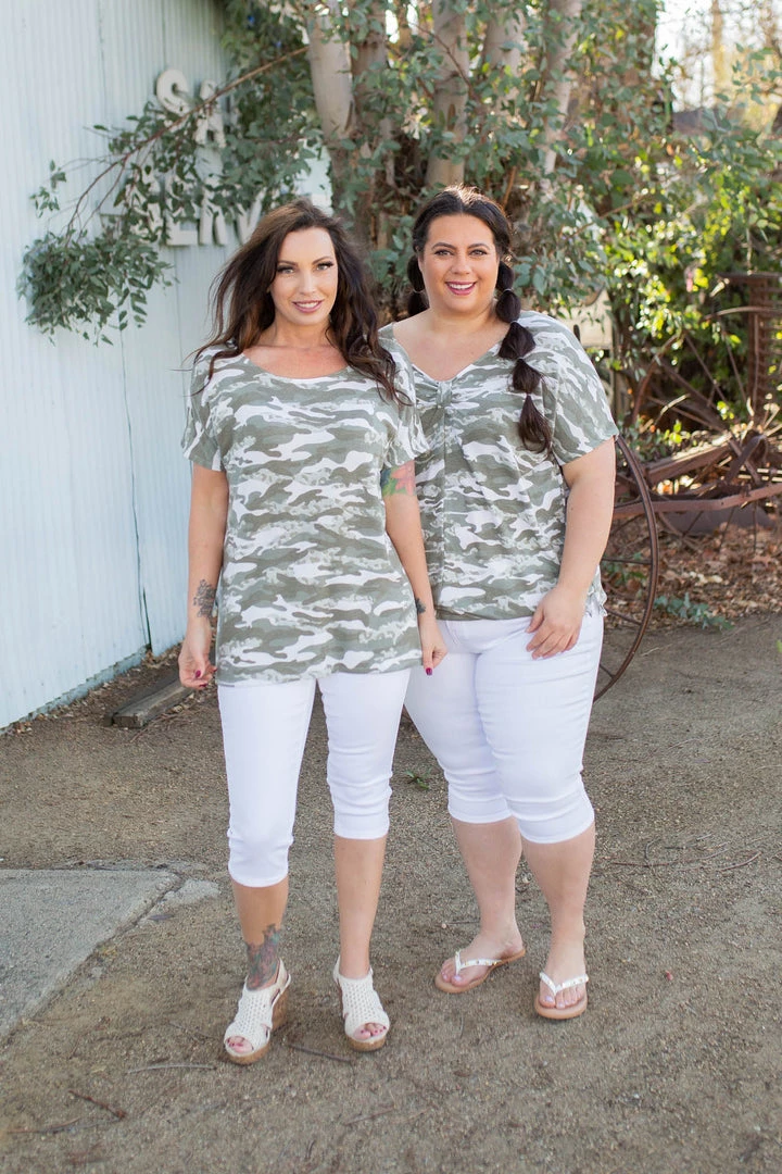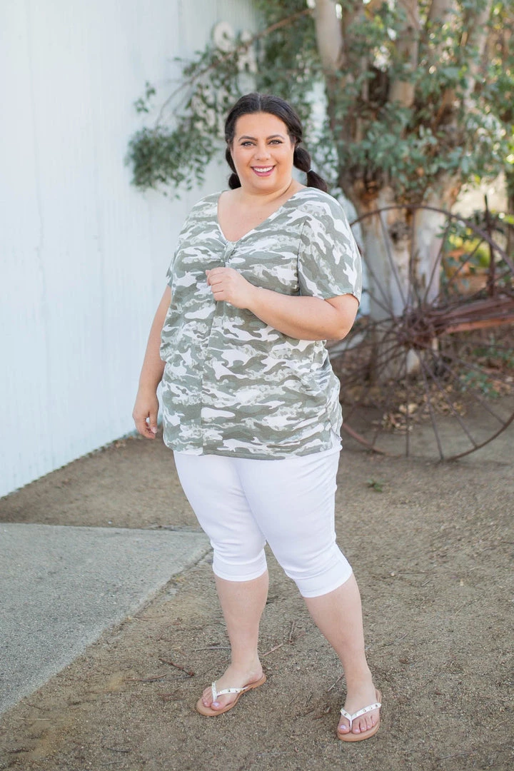 We are head over heels for this short sleeve camo top, especially because it’s reversible! Talk about versatility. With a gathered knot, this top can be worn with a v-neck or rounded neckline.