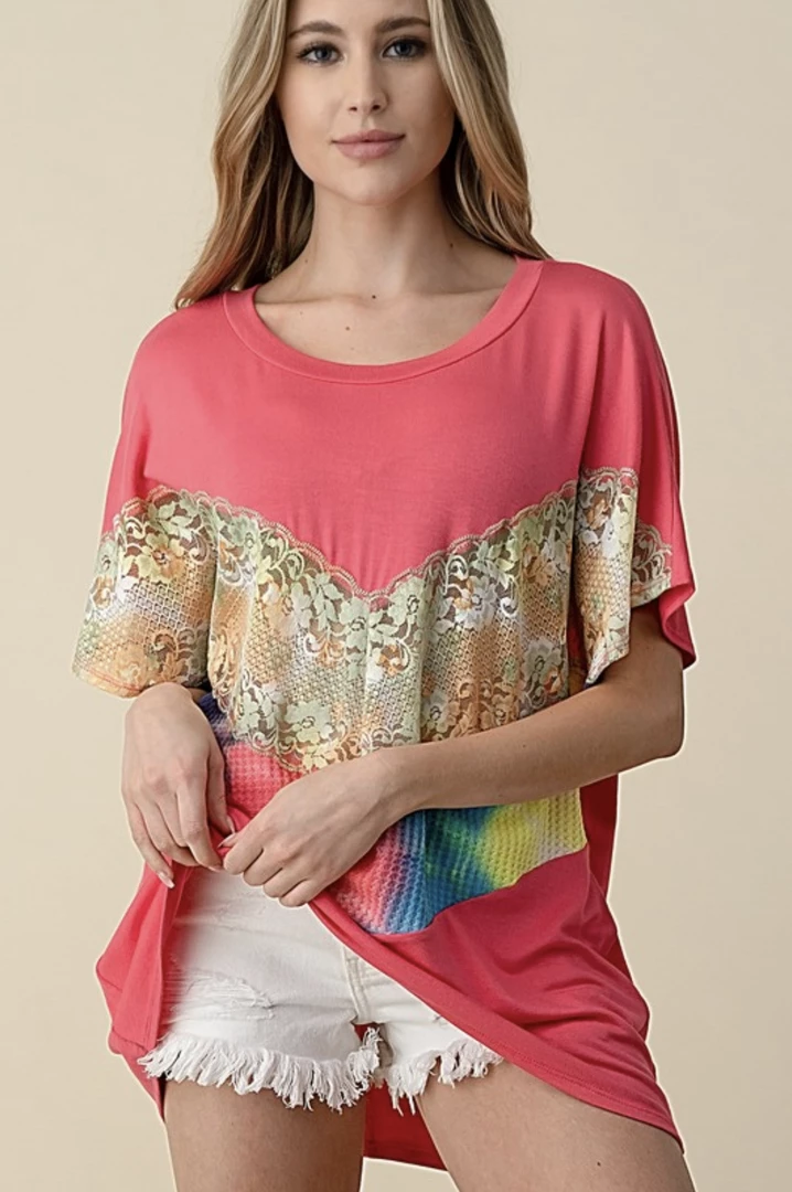 This tunic defies all odds! Featuring a stunning tie dye and lace color block chevron, short sleeves, round neckline with a relaxed fit, you’re sure to make a statement in this piece.