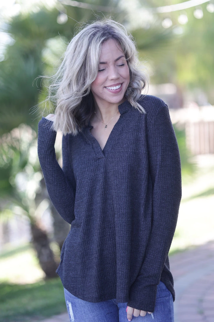 We are all already head over heels for the way the Gabby’s fit and feel, but to add thumbholes!! Yes please! Made from a light sweater material, this top features a relaxed fit, banded collar, v-neck and long sleeves with thumbholes!