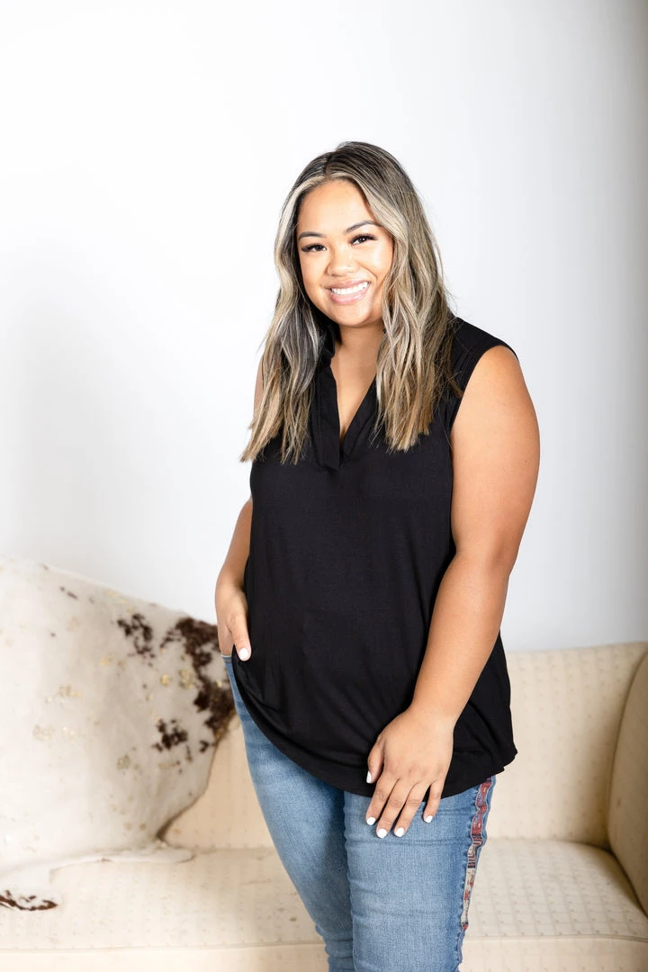 This sleeveless gabby is the perfect everyday wear piece! Wear it on it’s own or layered under your favorite cardigan/jacket. With a relaxed tunic fit, this top features a V-neck with mandarin collar and hi low hem.