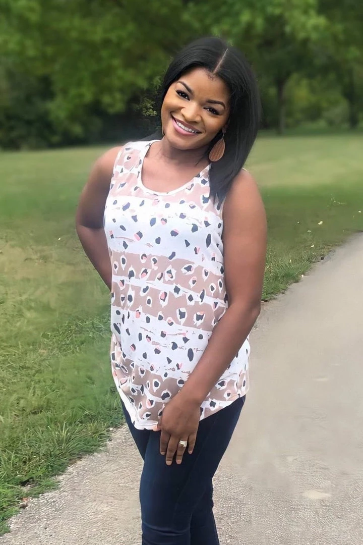 Bring sexy back with this animal printed open back sleeveless top. We love the subtle colors of this print, and it will pair so well with so many things. Wear this piece alone, or under your favorite layering piece. Featuring a scoop neck, rounded hem and relaxed fit.