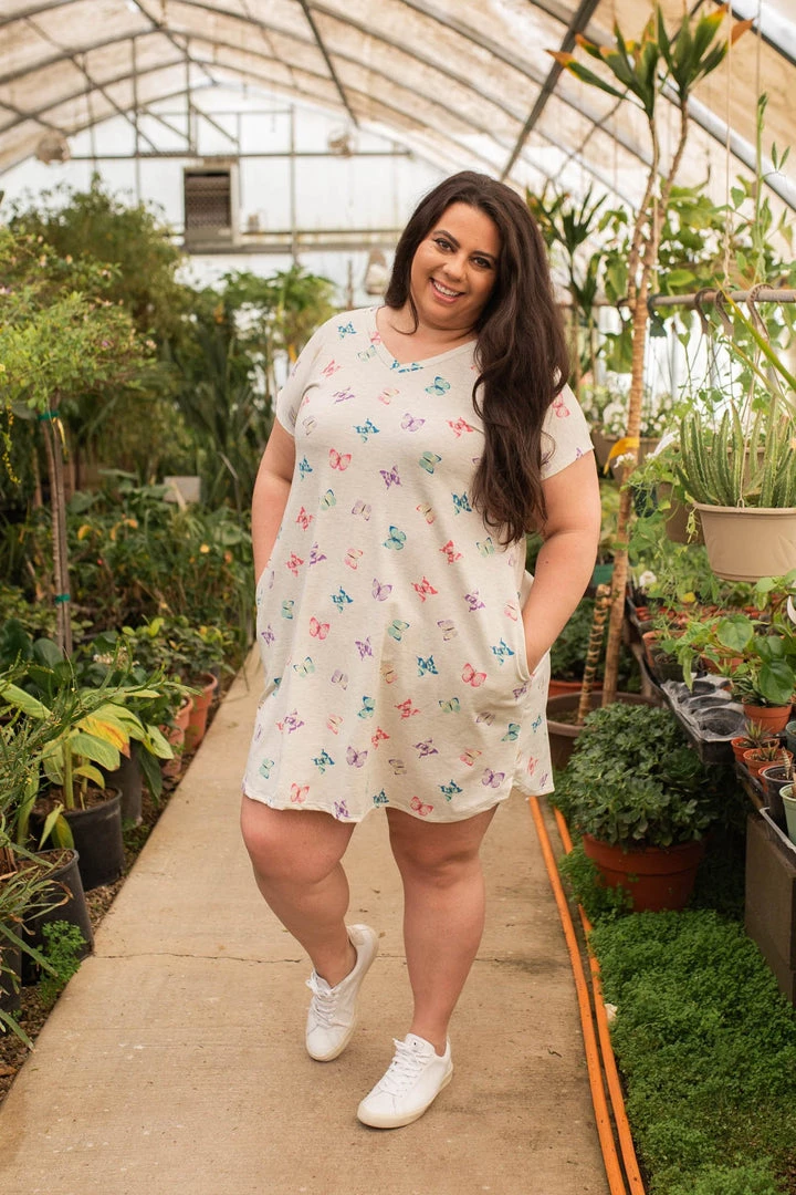 Kissed by butterflies, is how you will feel when wearing this oh so comfy swing dress! Made from a terry fabric, this dress is thick enough that it will not be see through in the least. TheΒ fit is sheer perfection, featuring a v-neck, short sleeves and POCKETS!!Β
