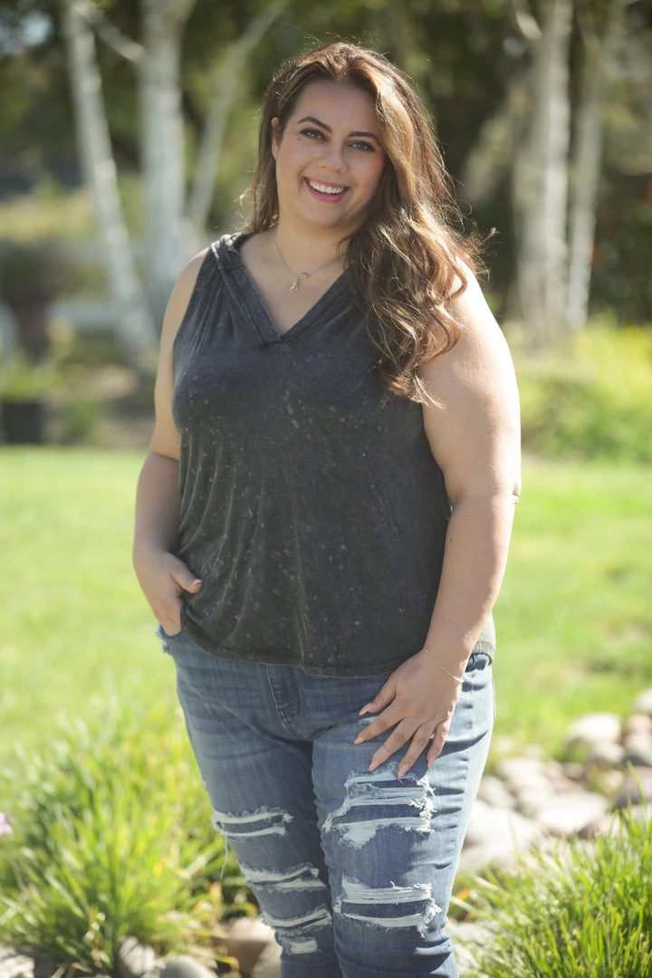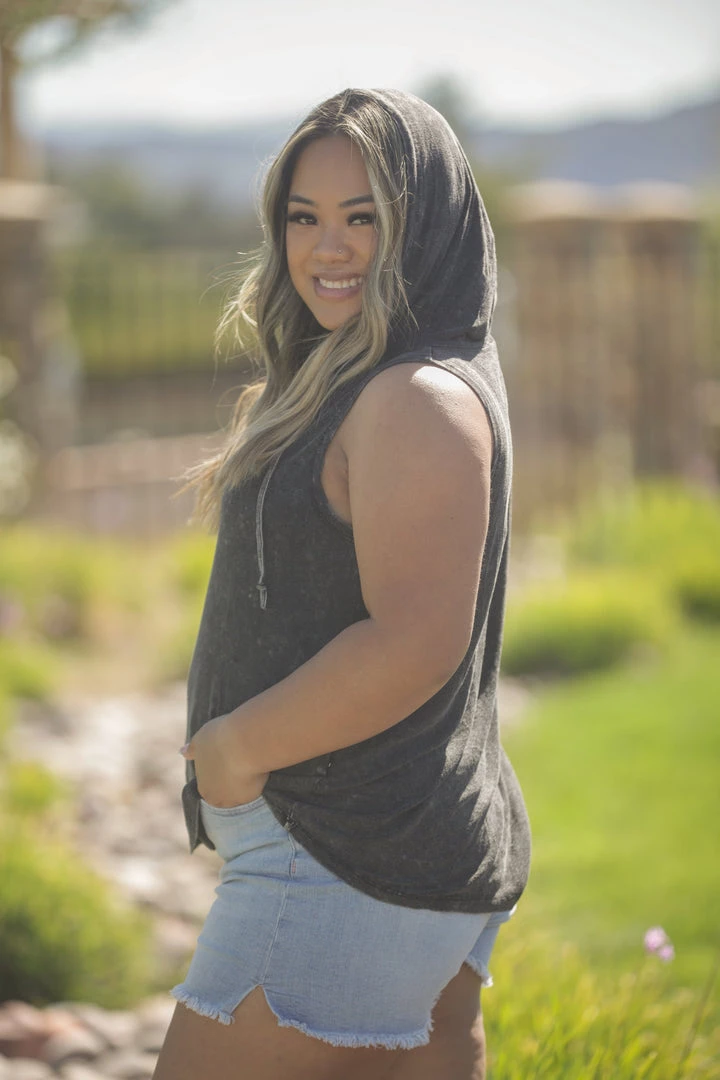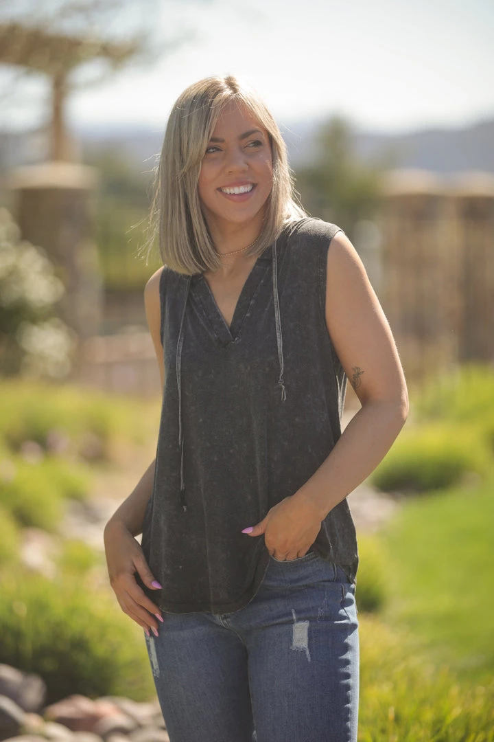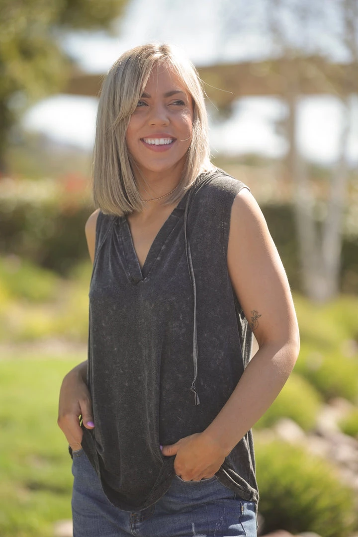 You will become absolutely captivated with this buttery soft mineral washed black sleeveless hoodie. Not only is it super comfortable, but it can be worn alone or layered under your favorite cardigan for a fun & sporty look. With a relaxed fit, this top features a v-neck, functioning drawstring hood and hi low hem.