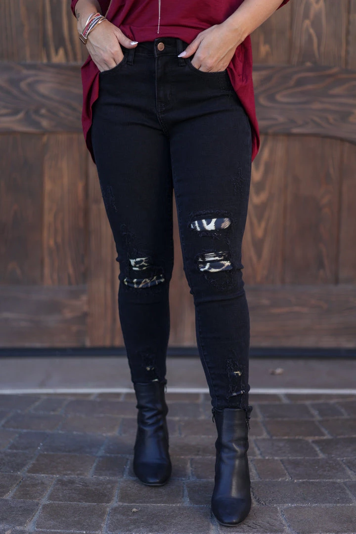 Now if these Judy blue skinnies are not the cat’s meow, we don’t know what is. With classic Judy Blue stretch, these skinnies feature leopard print patches and a destroyed hem, making them so easy to wear with sandals or boots.
