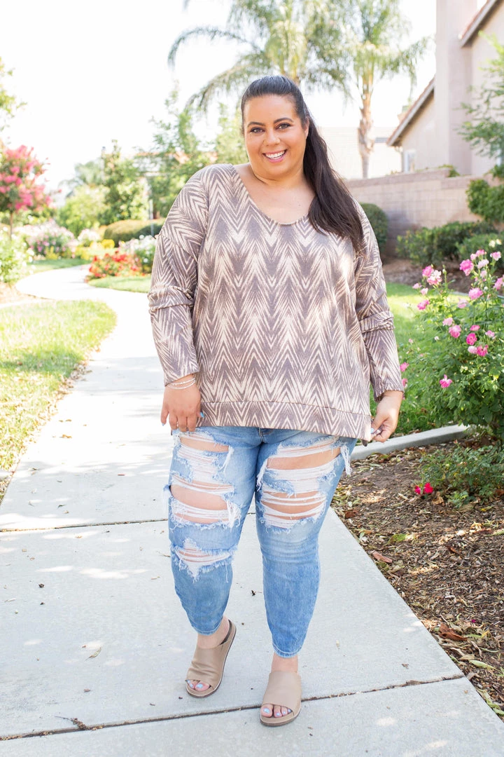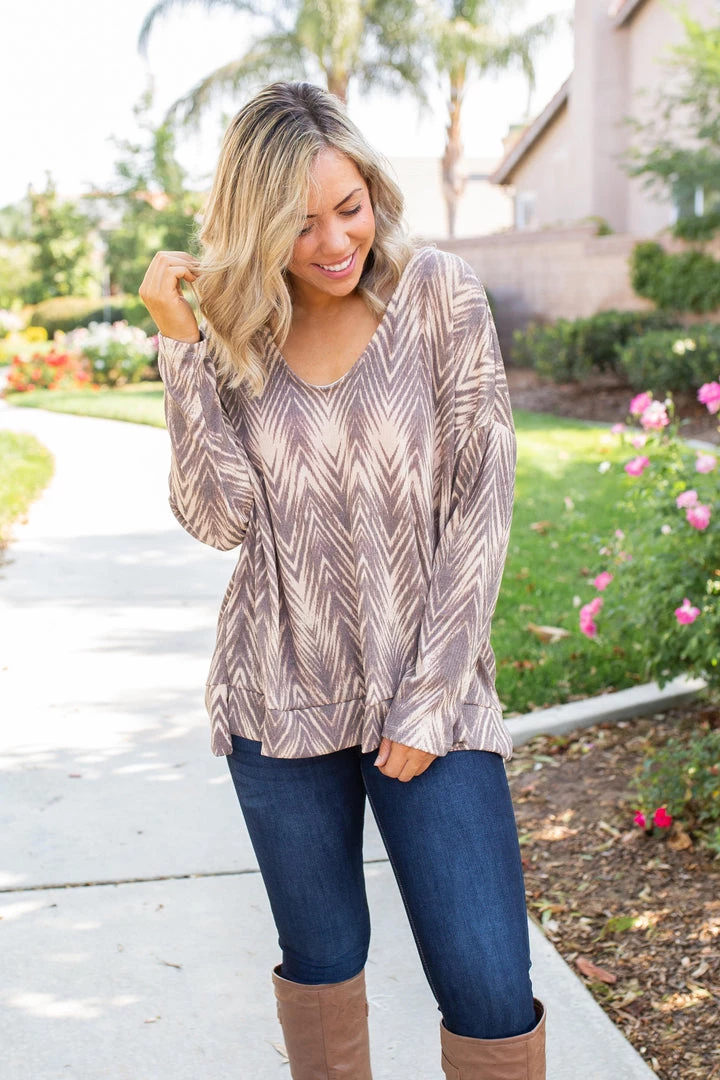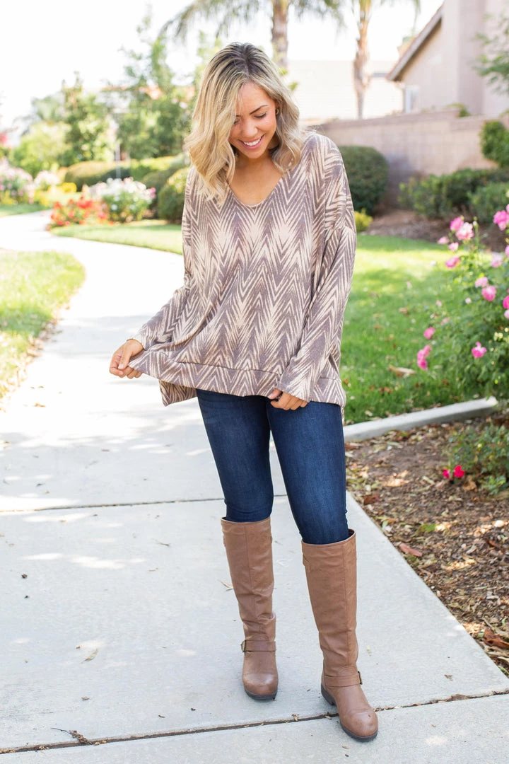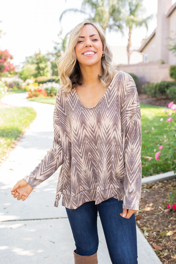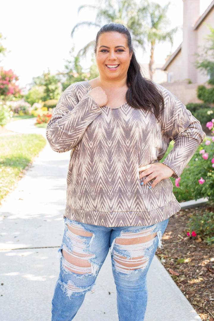 The mocha chevron print in this super soft long sleeve top reminds of the most delicious chocolate With an oversized fit, this topo features long sleeves, scoop neck and side slit hem.