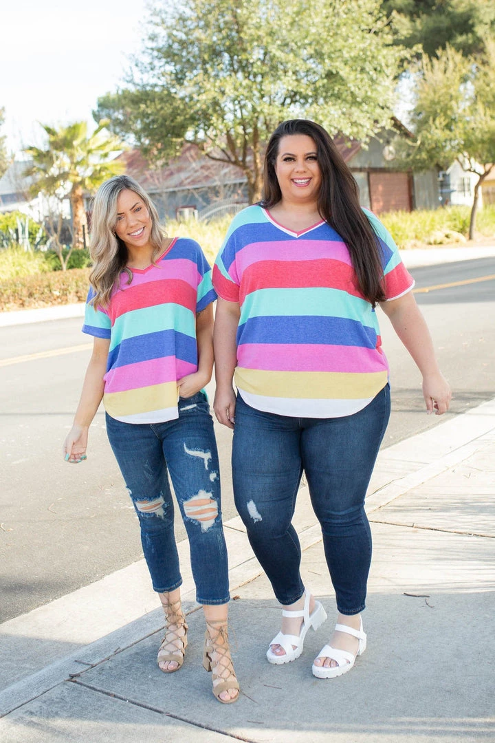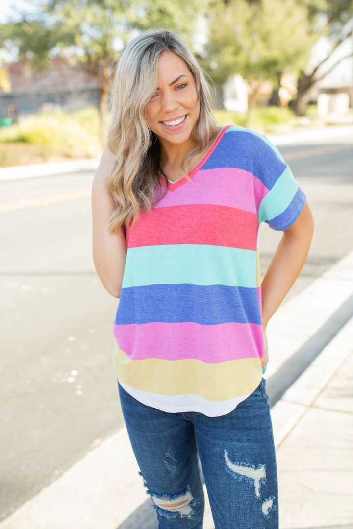 The colorways in this striped short sleeve top are the classic seaside colors. Featuring a relaxed fit, short dolman sleeves and a v-neck, this top will pair well with just about anything.Β Β .